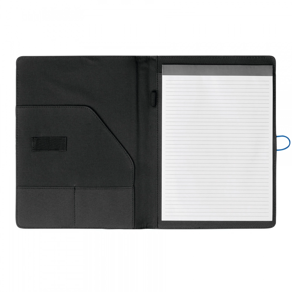 Portfolio SESSION in DIN A4 format, includes writing pad, loop for writing utensil, various slip-in pockets, metal hook with coloured elastic band for closing