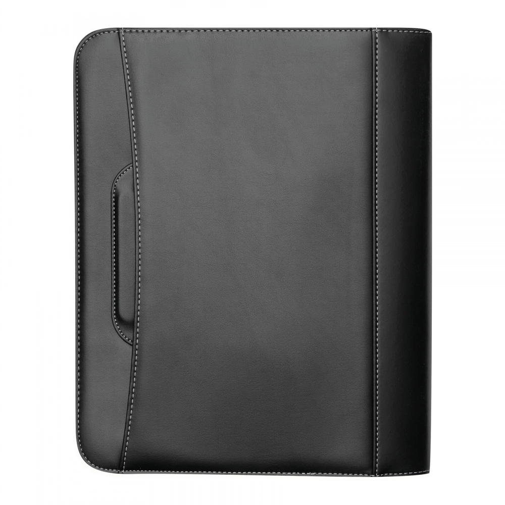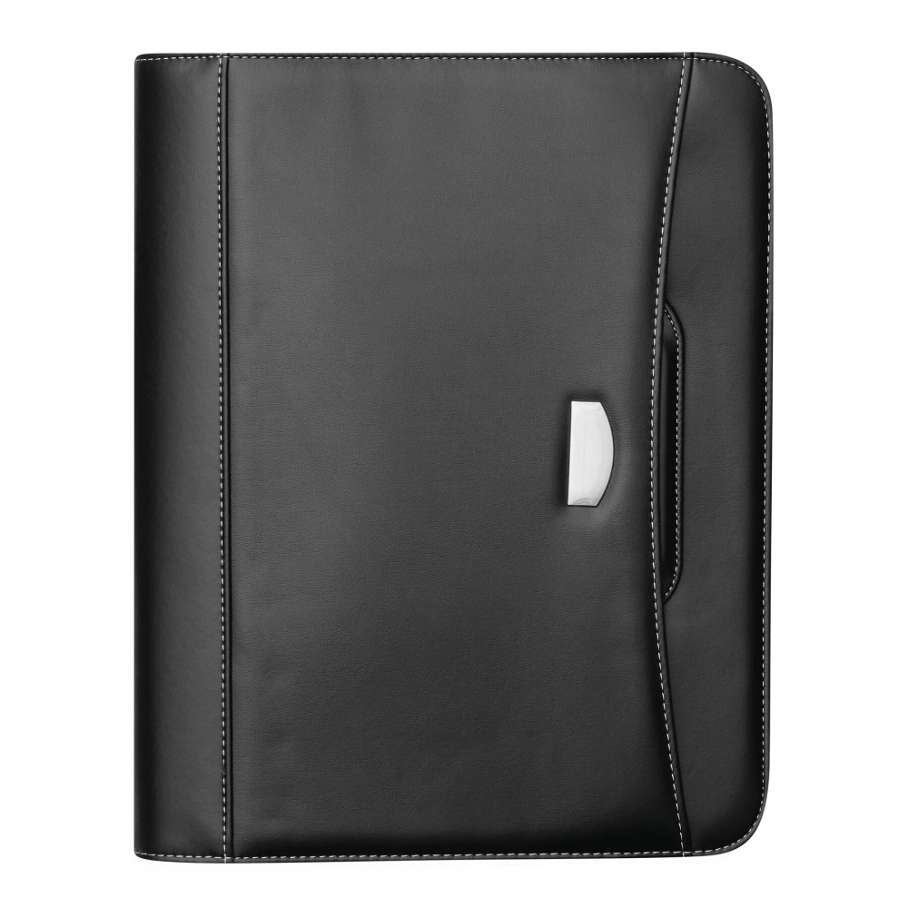 Good quality synthetic leather portfolio NOBLESSE in DIN A4 format with zip, ring binder, calculator, writing pad, loop for a writing utensil, various pockets, carrying handle, white decorative edge stitching and metal plate for your logo.