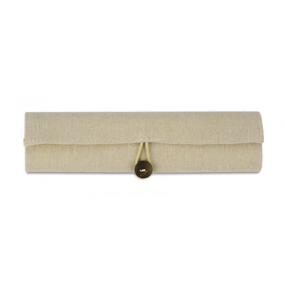 Eco pencil case made from cotton linen. Closed with a button. Set includes 3 eco ball pens (black, blue, red), pencil, sharpener, eraser, ruler. Logo will be printed.