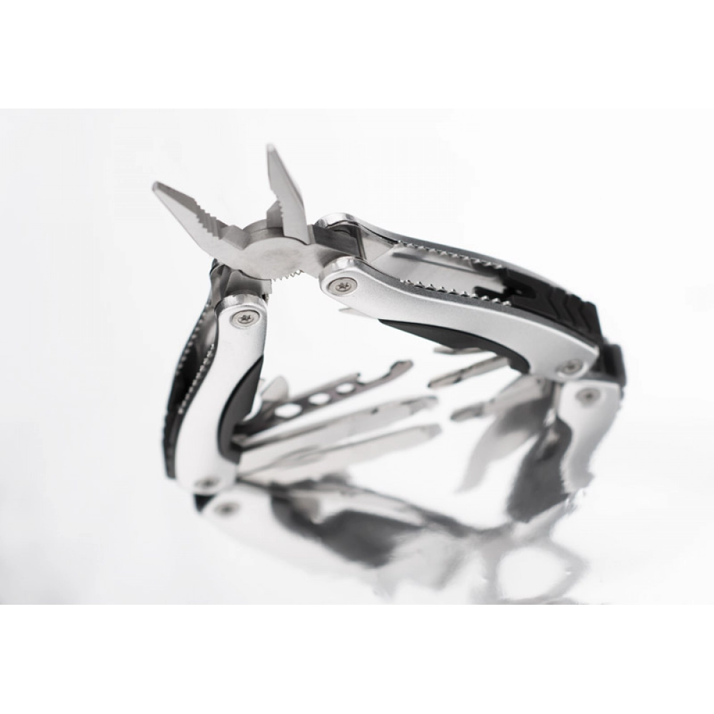 The WORK tool is a very good choice among pocket multi-tools. It has the following functions: pliers, cutter, smooth blade knife, saw, file, flat and cross screwdriver, bottle and can opener, and three sizes of ring wrenches. The set also includes a black tool bag made of Oxford fabric.