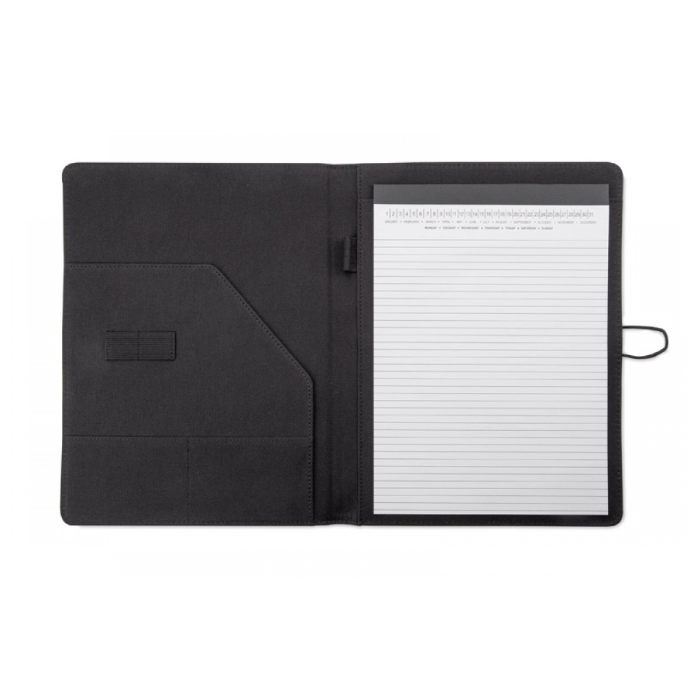 Simple and modern looking portfolio. Inside there is a large pocket.2 small pockets, 2 USB memory sticks holders, place for a ball pen, notebook. Portfolio is closed with a elastic band attached to a metal hook. Notebook is not stuck to the cover, but only slid on the pocket, which makes it possible to change the notebook.