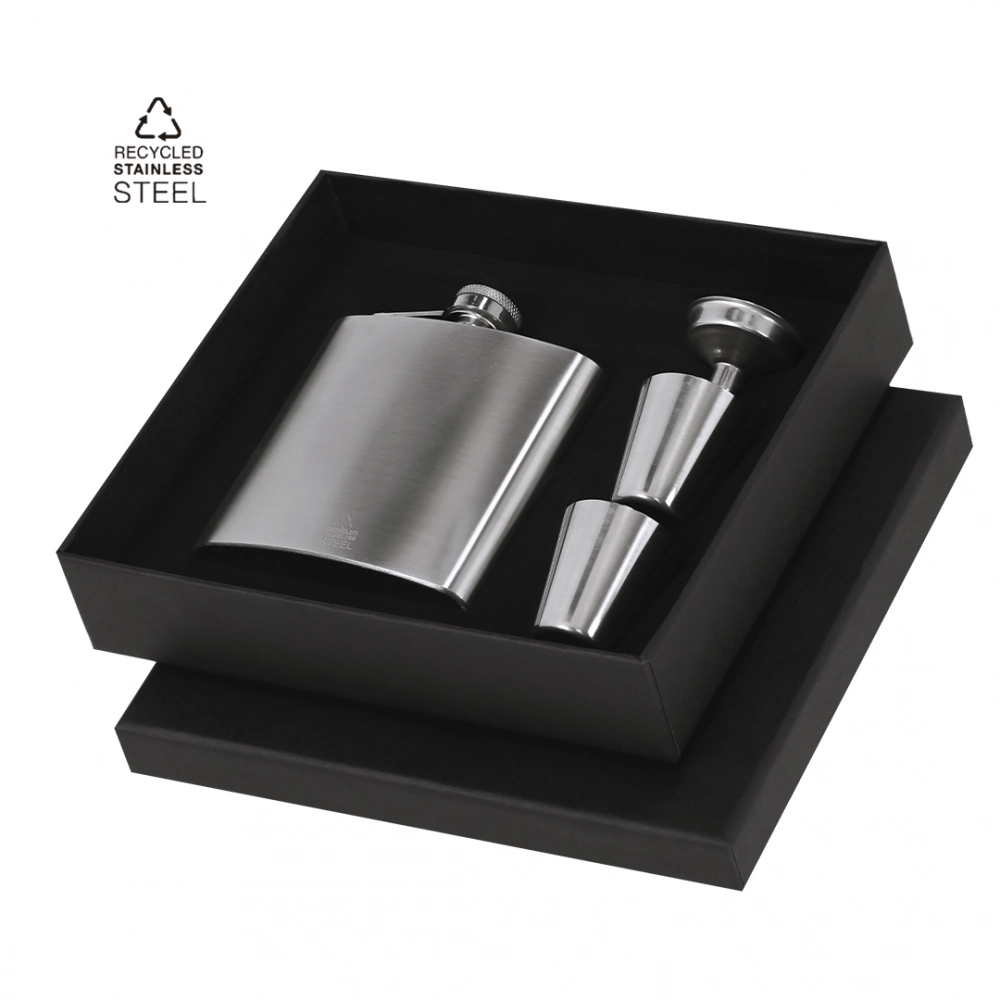 Features Flask set with accessories in Recycled Stainless Steel. Includes:- 175 ml flask with drip-free system and screw closure for safe storage without spills.- Two measuring cups of 30 ml capacity.- Dosage funnel, which facilitates filling.Includes Recycled Stainless Steel label. Presented in a black box.Steel is one of the most demanded materials and can be found almost everywhere, from daily-use products to large constructions. With countless properties, among which durability and high level of reusability stand out, making it a highly valued alternative in sustainability solutions. Properly treated, it allows obtaining new resources of infinite use. 175 ml. 4 Accessories Recycled Stainless Steel Final Packing 1 set/ Black Box Master Box Pcs: 30 Height: 24 cm / Width: 19 cm / Length: 44 cm / Weight: 7.3 kg Pallet Pcs: 2520 Packages: 84 Weight Aprox: 613.2 kg
