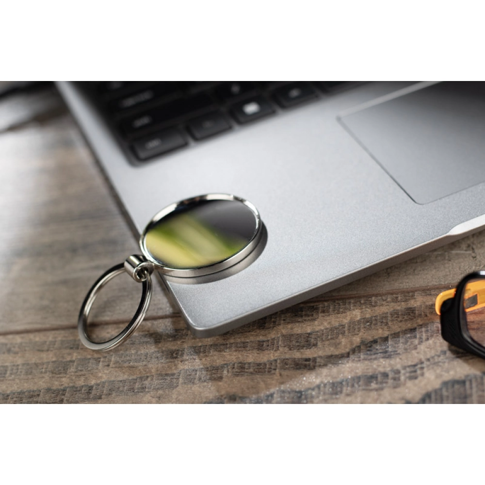 DOMIO is a round keychain made of high-quality metal, designed for doming marking service. This technology allows for the precise application of a company’s logo in the form of an aesthetic resin sticker, which creates a 3D-like effect.