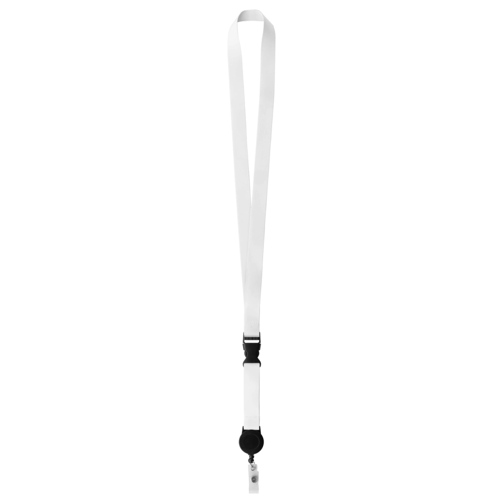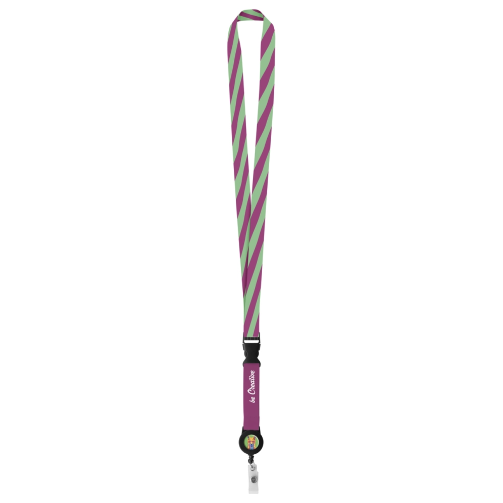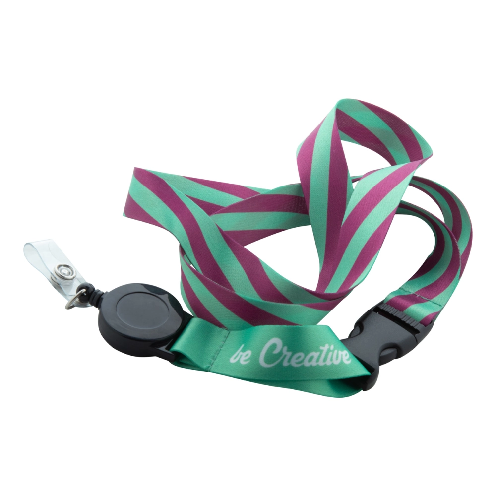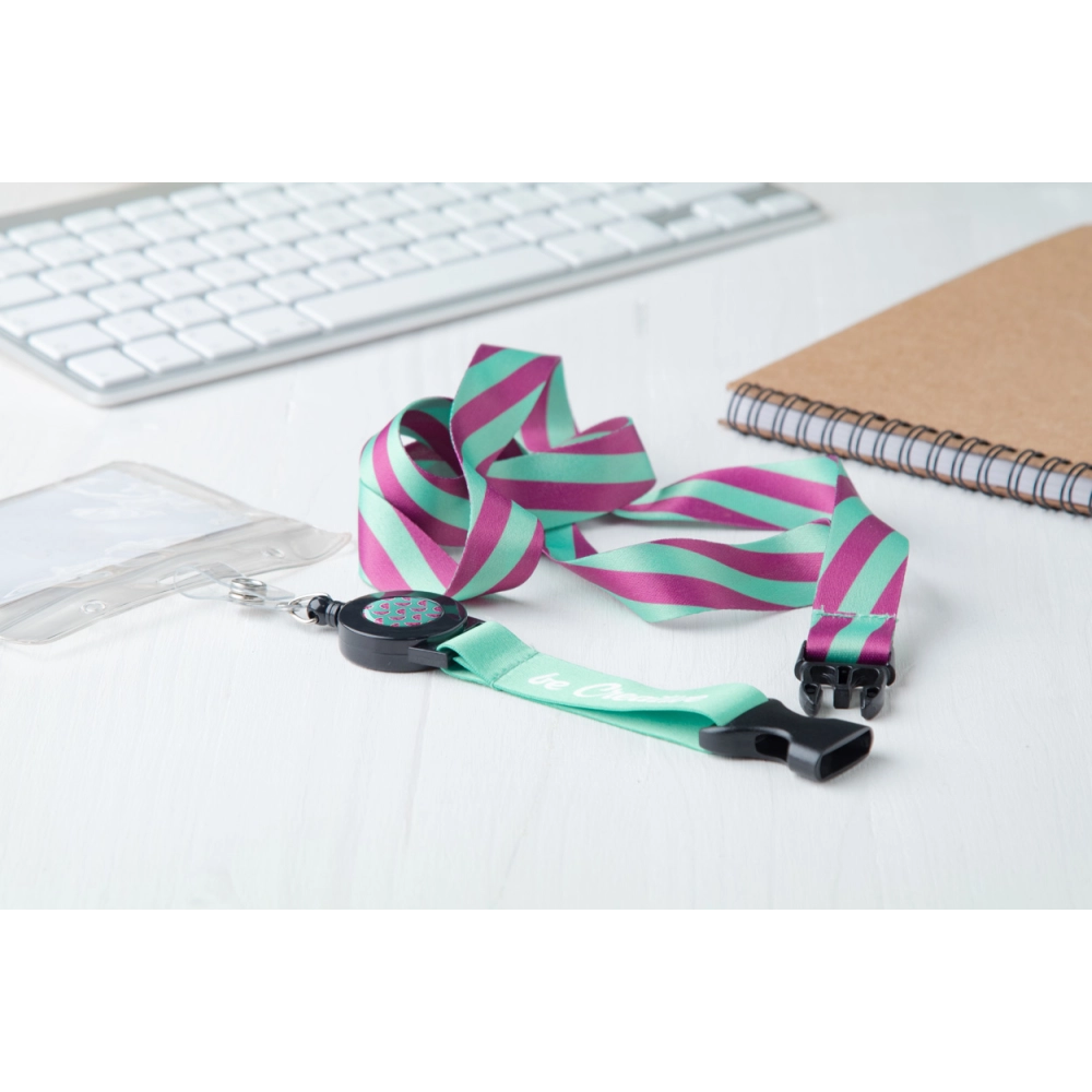 Custom made, wide polyester lanyard with detachable telescopic pass holder. With sublimation printed graphics on both sides. MOQ: 100 pcs.