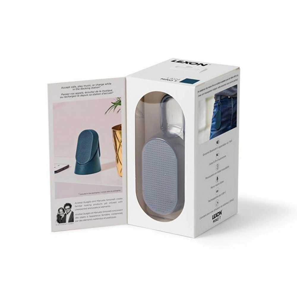 Mino T is a versatile Bluetooth speaker designed for travel. The carabiner allows you to easily attach it to a bag or bike. Thanks to its elegant design, it will harmoniously fit into any interior, becoming a modern element. Equipped with a passive bass system, Mino T provides quality listening, ensuring balanced and rich sound on the go. Don't worry about rain: its super durable coating makes it waterproof. Enjoy up to 5 hours of autonomous operation on any adventure. Answer calls, listen to music, or charge the speaker via USB-C cable by placing it on the dock. - Bluetooth® speaker with built-in carabiner - TWS technology compatibility - IPX4 waterproof rating - "Hands-free" microphone - Remote control for selfies - Bluetooth® 4.2 - Battery life: 5 hours - Charging time: 2 hours - Bluetooth® distance: 10m - Power: via USB C port, cable included