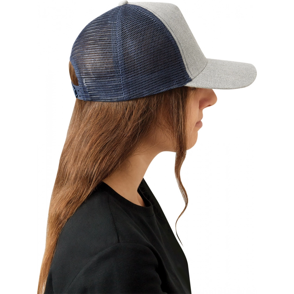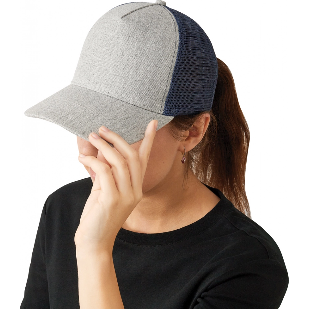 5-panel baseball cap CASUAL FIT, 2-coloured: reinforced front segment, other segments made of mesh, size-adjustable, double-row plastic fastener at the back