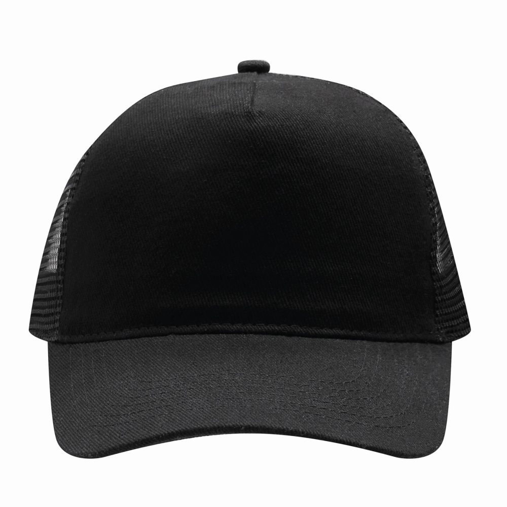 5-panel baseball cap FASTBALL: reinforced front segment made of brushed cotton, other segments made of mesh, adjustable in size, double-row plastic fastener at the back