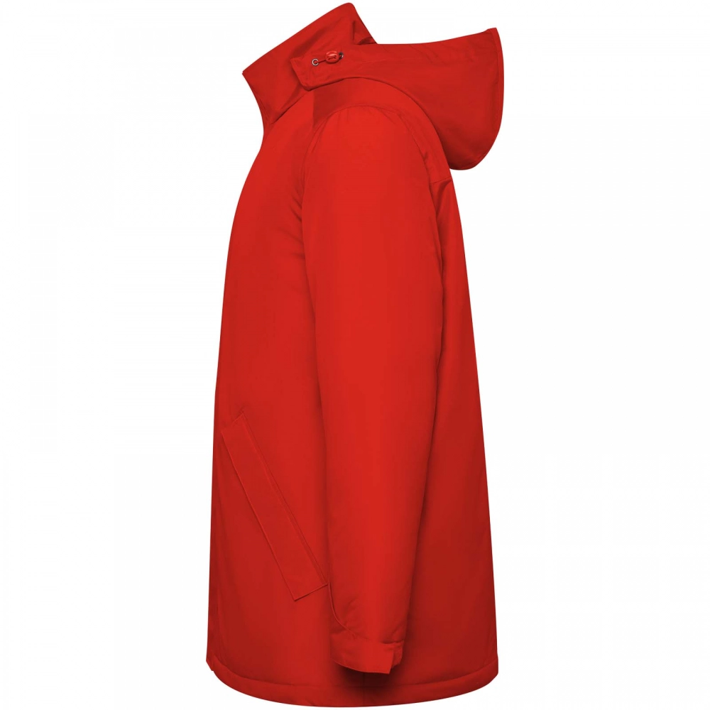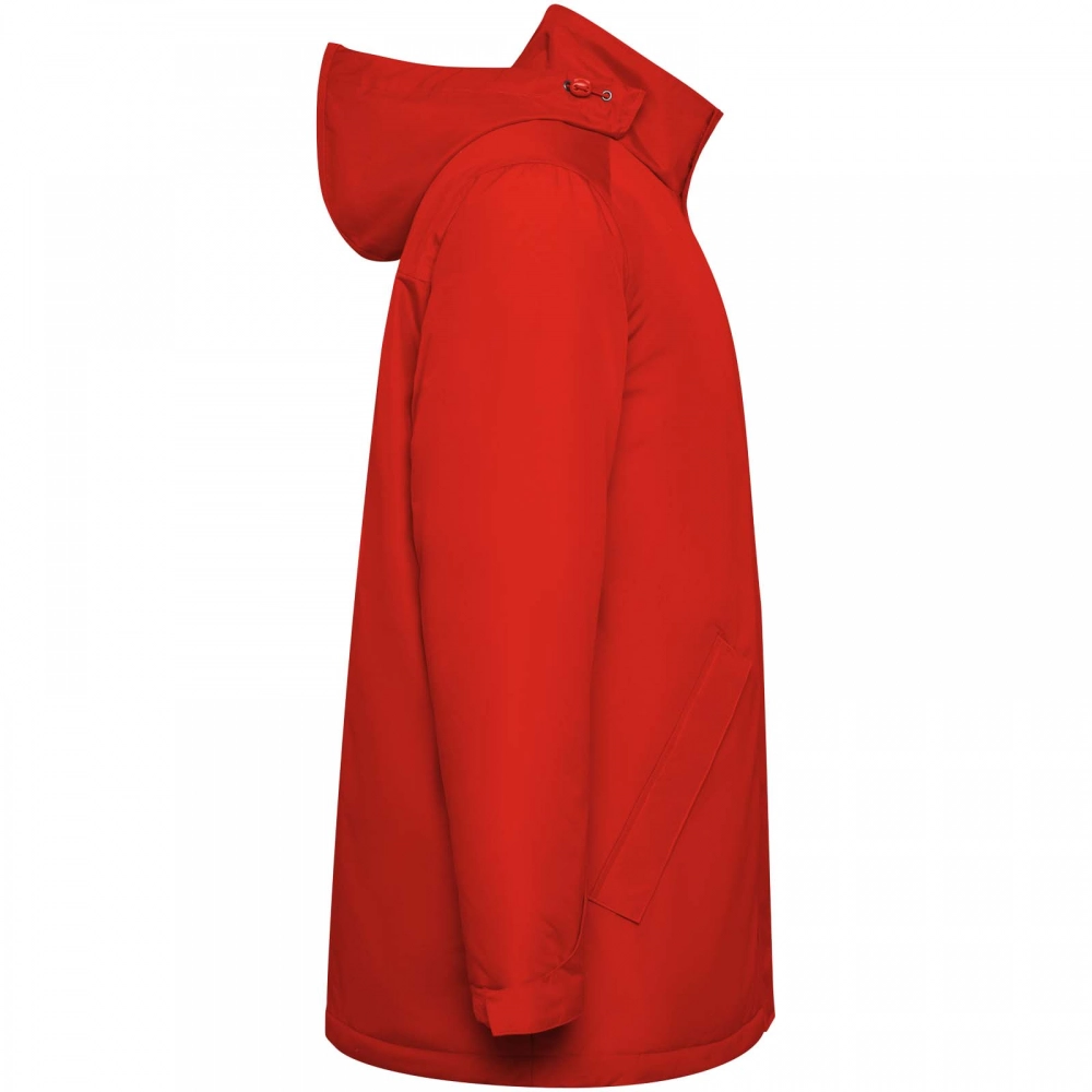 Waterproof padded parka jacket for kids. High collar with folding hood and hook & loop closure. Matching central zipper with flap. Side pockets with zipper and fixed flap. Interior pocket with hook & loop closure. Adjustable cuffs with hook & loop belt loop. Interior access for reinforcements on the back and left chest.