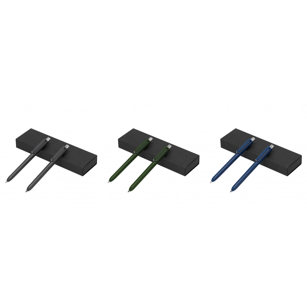 Features Set consisting of a blue ink pen and an eternal pencil, both made from RABS. The eternal pencil offers continuous writing, avoiding waste generation, and both have a push mechanism. Designed with matching clip and chrome details. Presented in a recycled black cardboard case. With RABS printed label. Pen and Eternal Pencil Recycled ABS Final Packing 1 set/ Black Box/ Black Paper Sleeve Intermediate Packing 1 50 pcs/ Box Master Box Pcs: 200 Height: 40 cm / Width: 30 cm / Length: 48 cm / Weight: 14 kg Pallet Pcs: 6400 Packages: 32 Weight Aprox: 448 kg