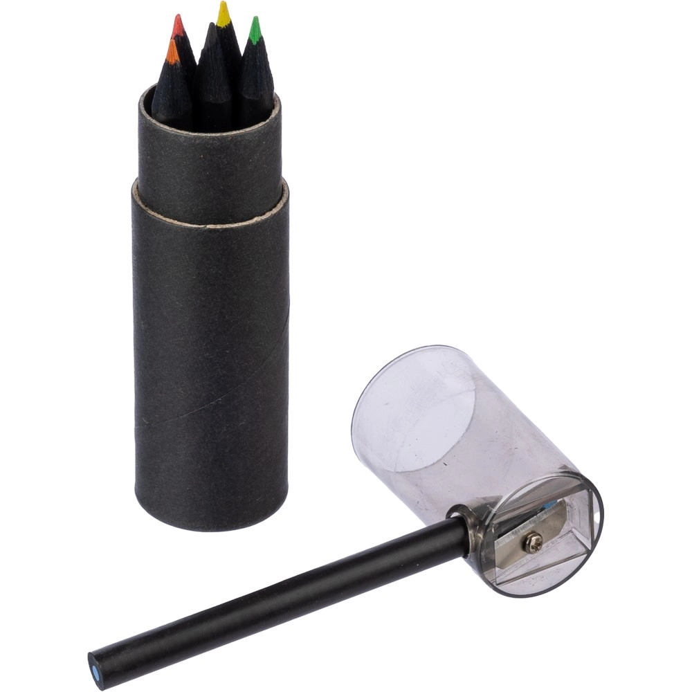 Set of 6 colour pencils with a decorative black shaft, packed in a round box and plastic cap with a built-in sharpener, making it easier to store and harder to damage the pencils, product made from recycled cardboard and ABS