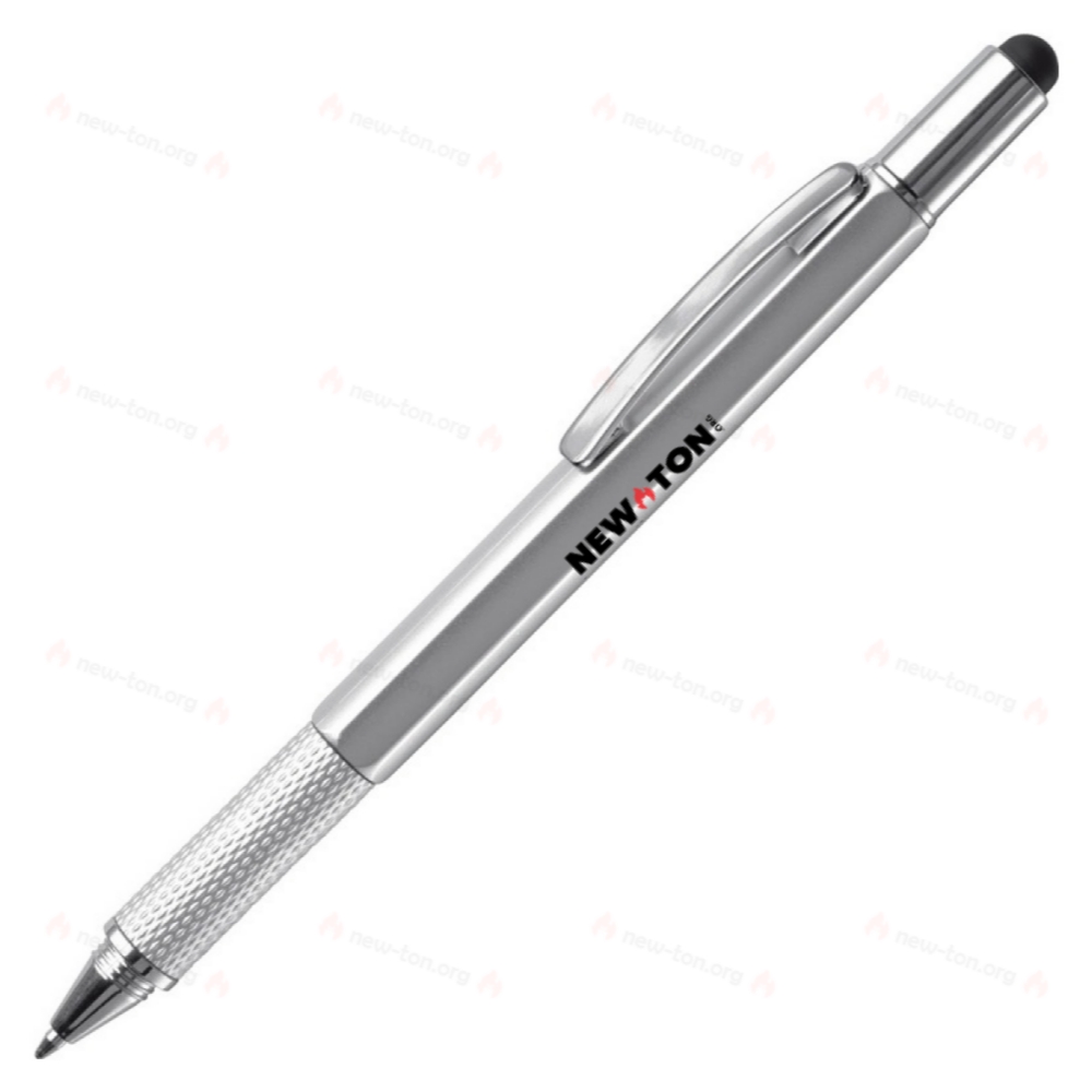 Multifunction ball pen with touchscreen tip, including a screwdriver, ruler and spirit level featuring blue ink.