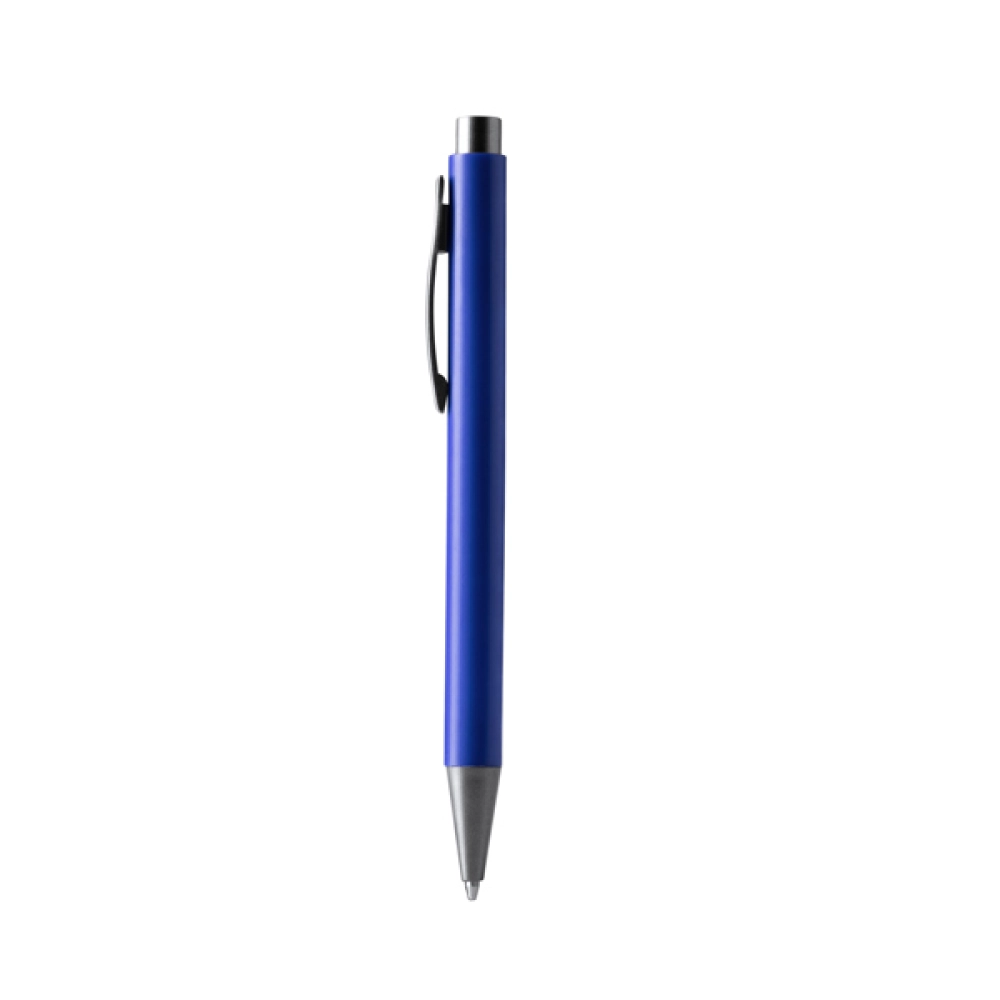 Push pen made of ABS with details in a matte metallic finish. Blue ink.