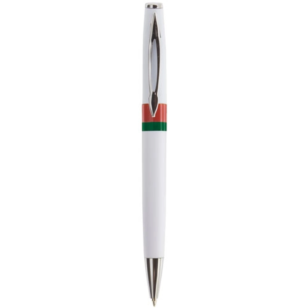 Ballpoint pen with rotating system and flag detail on the body. Blue writing.