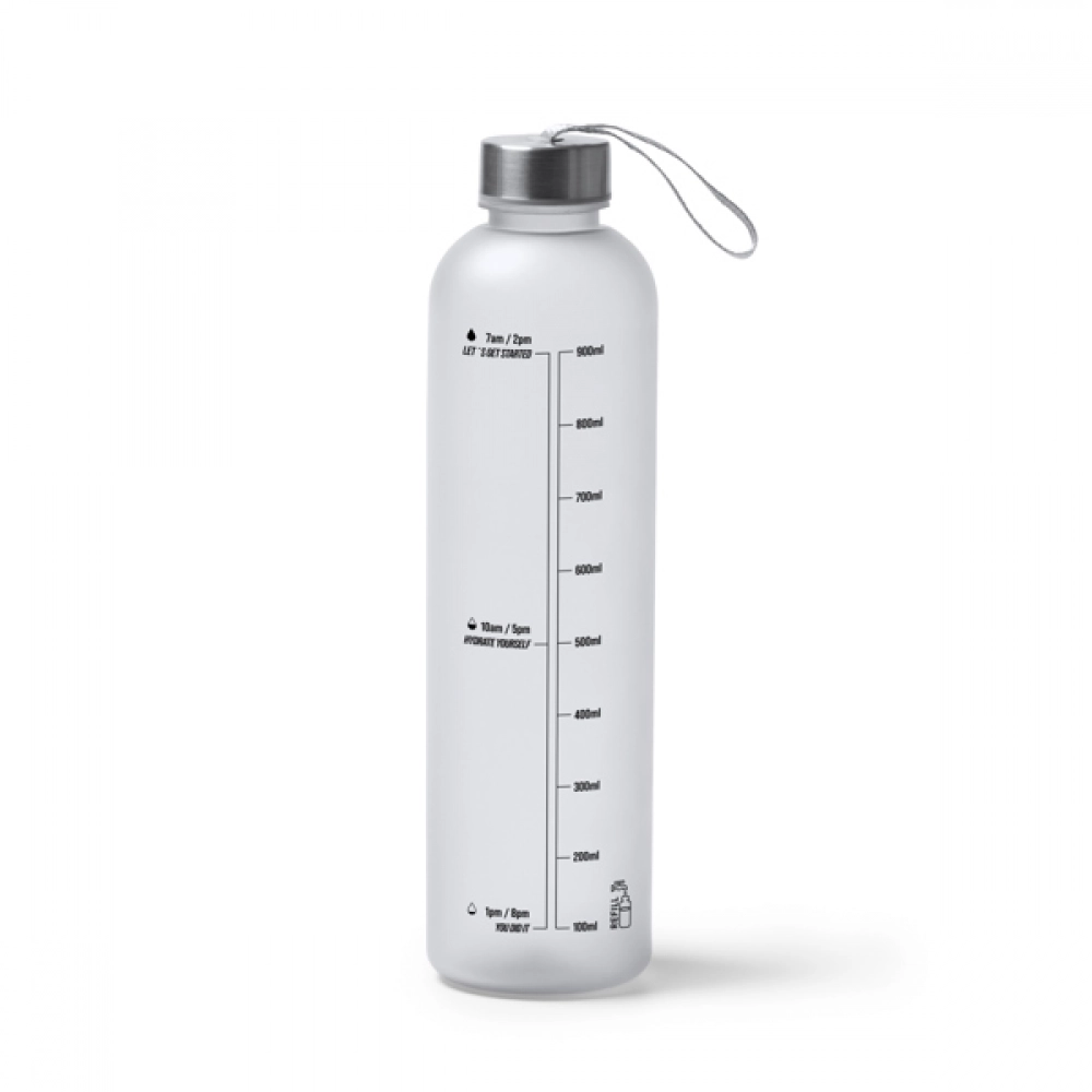 Tritan bottle with a translucent body, screw-on cap, and carrying handle. Includes hydration recommendation and capacity indicator. Capacity: 1L. Presentation in design box.