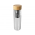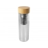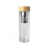 A double-walled borosilicate glass water bottle with a tea infuser and a bamboo lid. The bamboo used comes from sustainable, environmentally friendly, and socially responsible sources. Capacity: 400 ml. Comes in a box made of recycled cardboard.