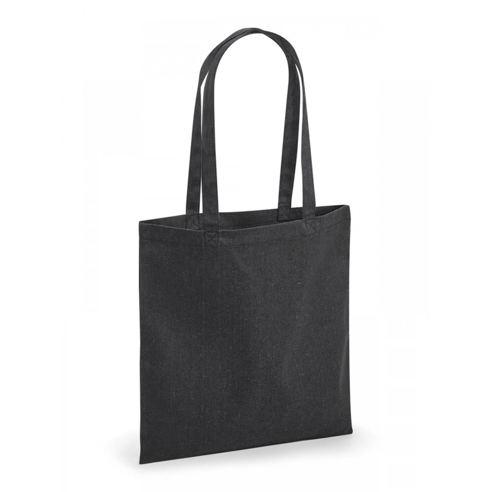 100% Recycled Cotton and Polyester blend. 270gsm (8oz/yd²). Tote made from a blend of pre-consumer recycled cotton and postconsumer recycled polyester. Recycled polyester made from 100% rPET, equivalent to approx. 2.5 post-consumer bottles.