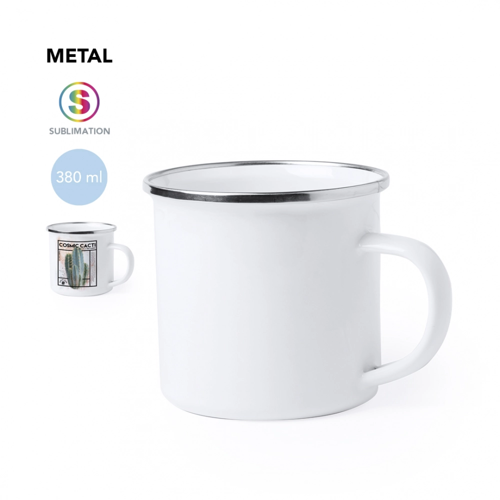 Features Retro design metal mug and 380ml capacity, with small imperfections for a vintage look. Especially designed for sublimation printing, with an elegant chromed ring and presented in an individual box. 380 ml