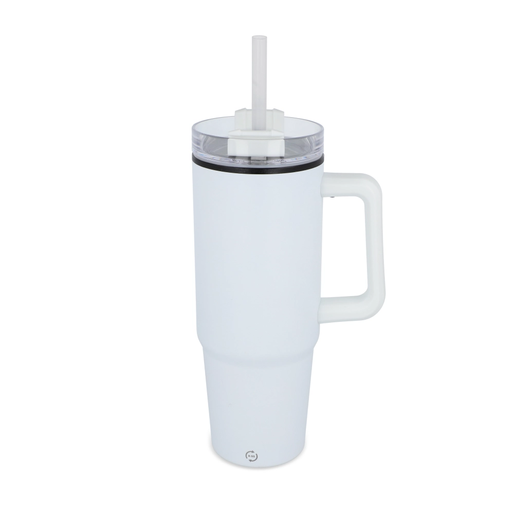 The Miami mug is a trendy 800ml insulated mug with a stylish vibe. Made from stainless steel with a recycled plastic interior, it features a narrow bottom to fit in most car cupholders, and a handle and straw to sip the day away. The GRS certification ensures a fully certified supply chain of the recycled material.