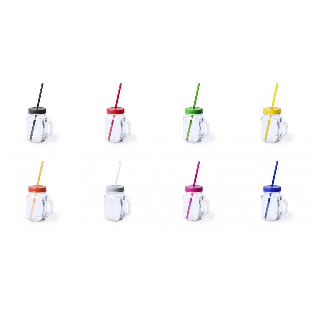 Features 500ml, multi purpose glass jar with cover and straw in bright tones. With metal cover and presented in an attractive design box. 500 ml
