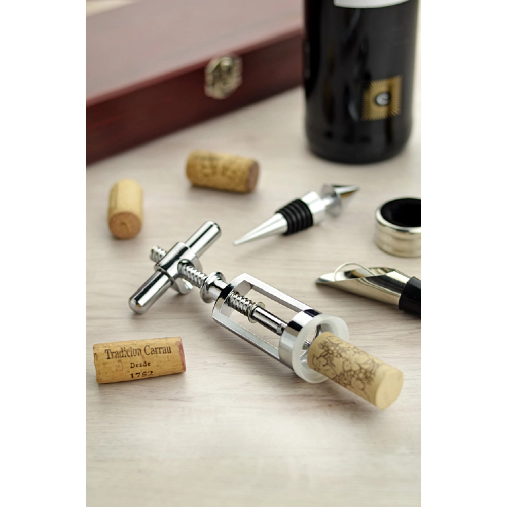 Wine set including corkscrew, 2 wine stoppers (one with pour function), wine rings. Everything is packed in elegant wooden box. Logo will be engraved on the box.