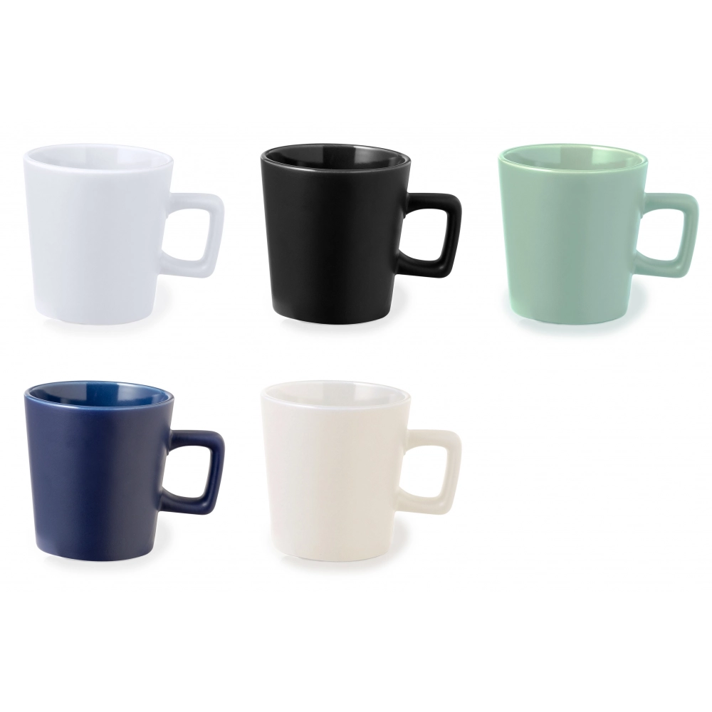 Features Ceramic mug with a capacity of 300 ml. Distinguished design with square handle and in several matt colours. Presented in individual box with kraft finish. 300 ml