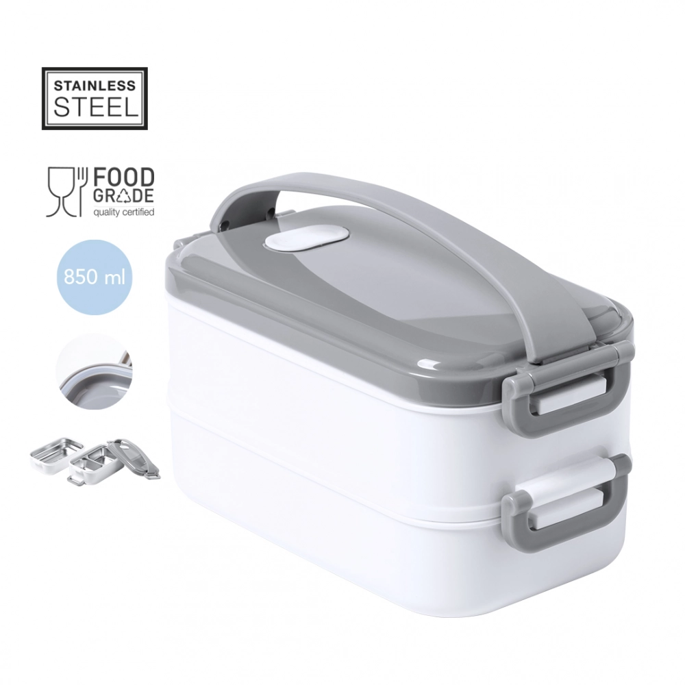 Features Thermal lunch box with 850ml capacity. Made of stainless steel and PP, BPA free. Includes 2 independent compartments with stainless steel trays and hermetic lid, 500ml and 350ml capacity respectively. Ideal for keeping the heat in, with the option of adding hot water to prolong it. 2 Compartments 350 and 500 ml