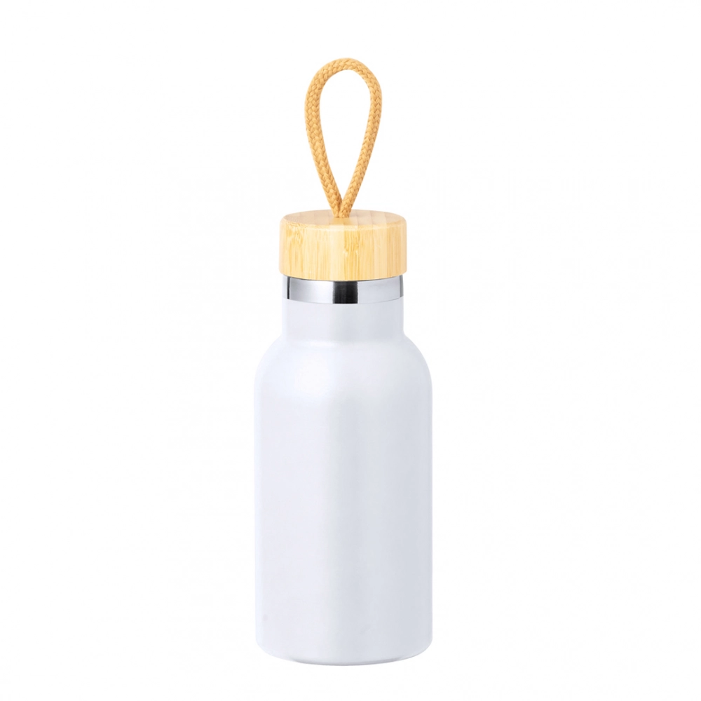 Features 350 ml capacity thermal flask, made of stainless steel with double wall. Includes original bamboo screw cap and carrying handle in natural colour. Available in a wide range of colours and presented in an individual kraft design box. 350 ml
