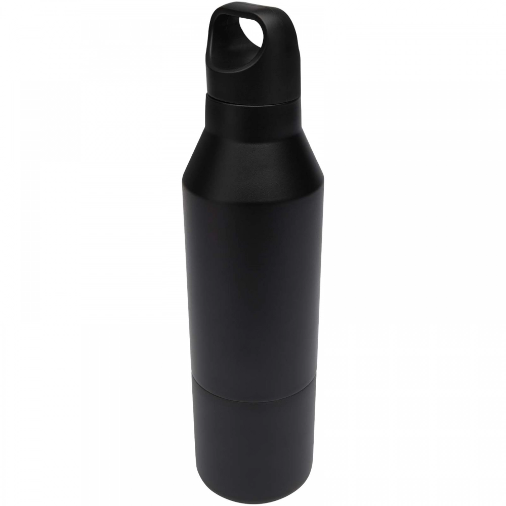 RCS certified stainless steel double wall copper insulated bottle with a removable cup. This multi-use bottle is designed to fit in the side pocket of a backpack, and has a convenient carrying handle that is integrated with the cap. Durable power coating on the outside. Keeps drinks hot for 12 hours or cold for 24 hours. Presented in a recycled cardboard gift box. Volume capacity bottle: 600 ml. Volume capacity cup: 300 ml.