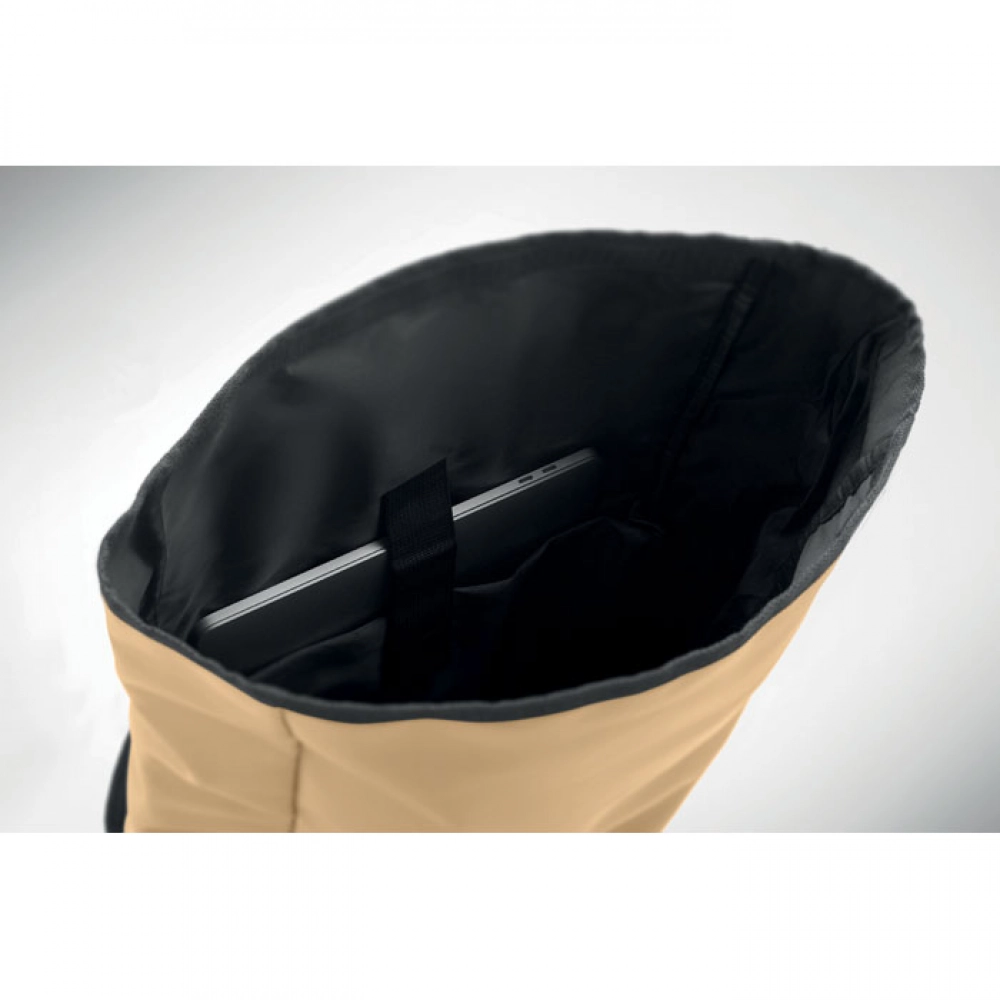 Roll top 15 inch laptop backpack in PU coated 600D RPET polyester and RPET polyester lining. Meshed padded back with zippered pocket and trolley strap. Padded shoulder strap with mesh inside finishing.