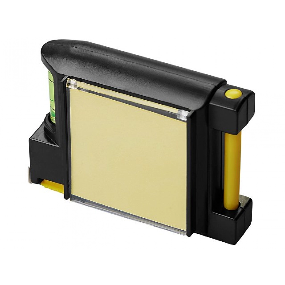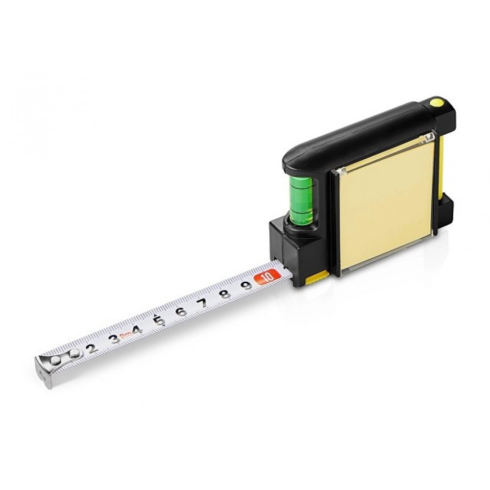 Compact 2m tape measure with useful features: - Notepad and pen for notes - Level - Clip for attaching to belt