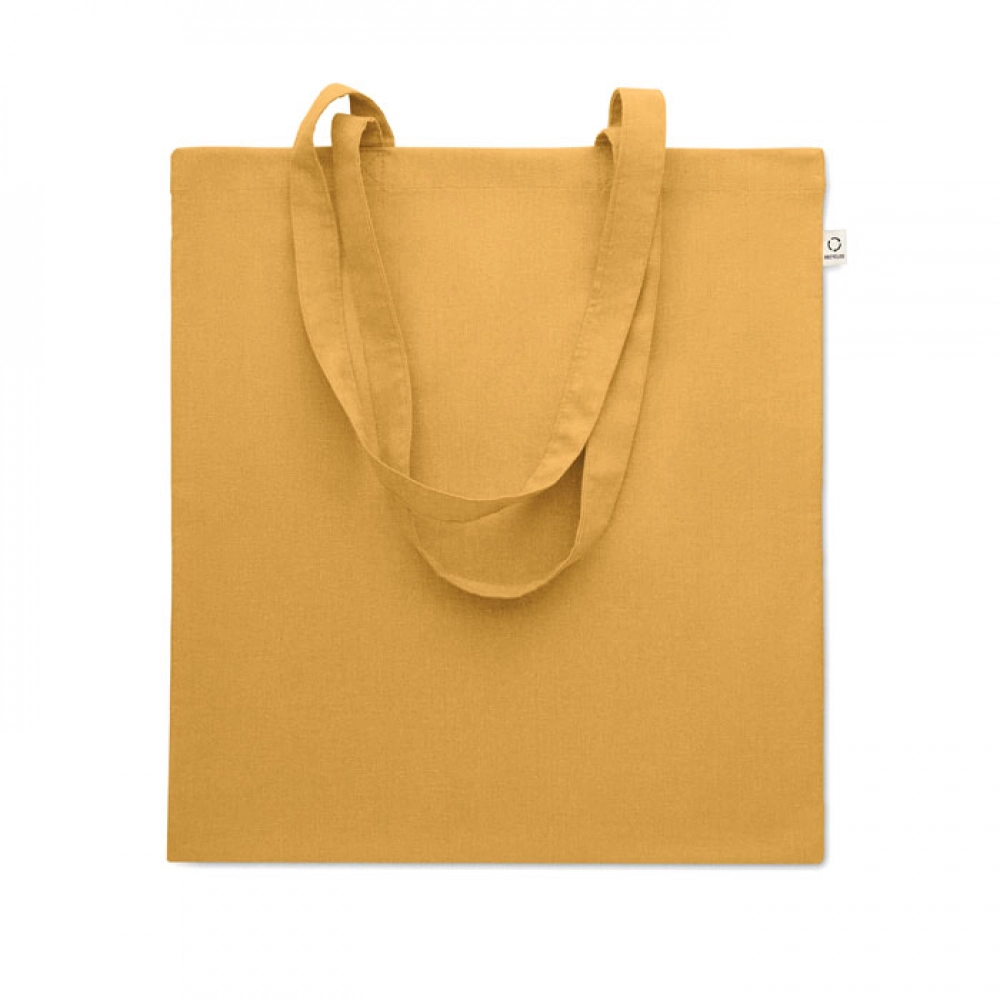 Recycled pre-consumer cotton shopping bag (70% recycled cotton and 30% RPET) with long handles. 140 gr/m². This item can shrink after printing.