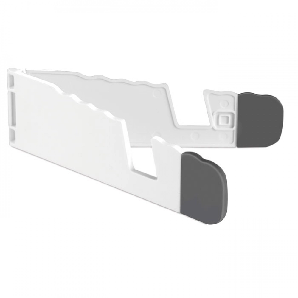 Складной держатель для планшета или смартфона из белого пластика. Края из серого силикона.