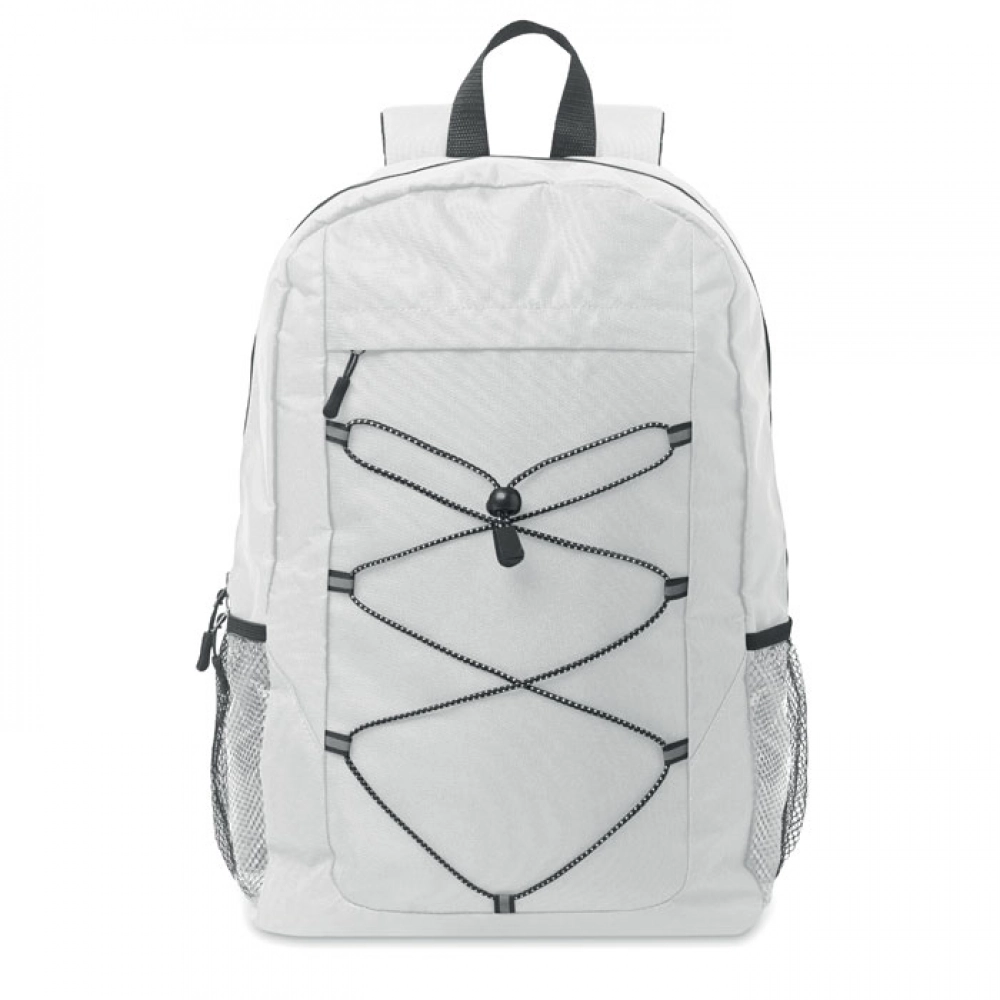 Backpack in 600D RPET polyester with decorating cord and front zippered pocket panel. Mesh pockets on both sides.