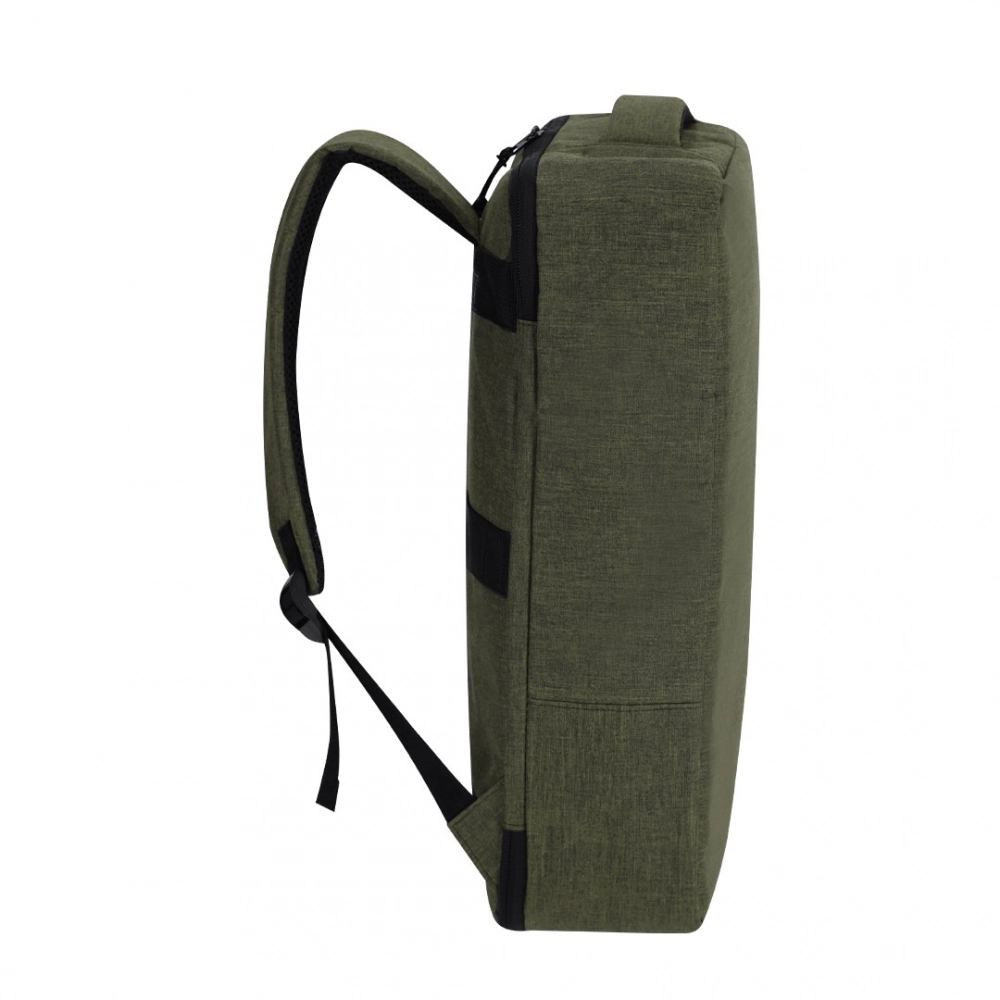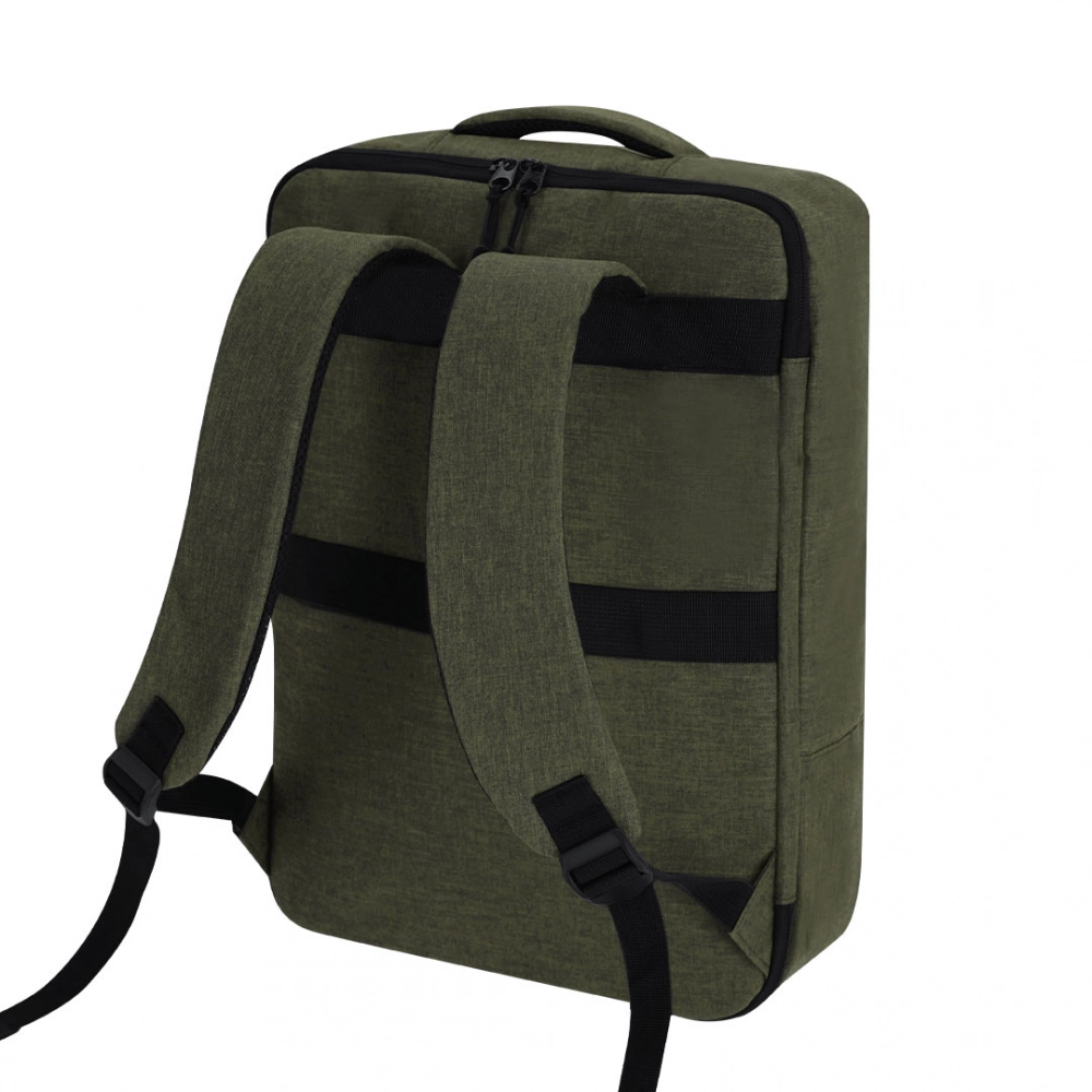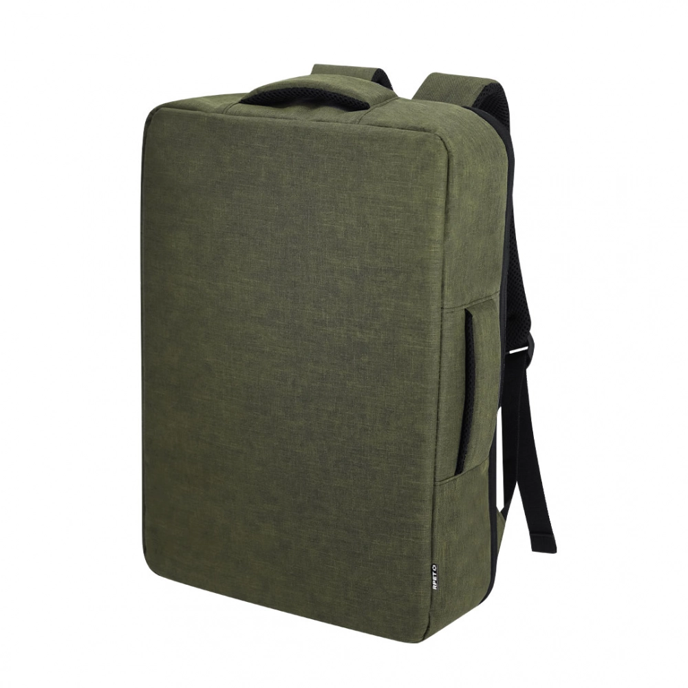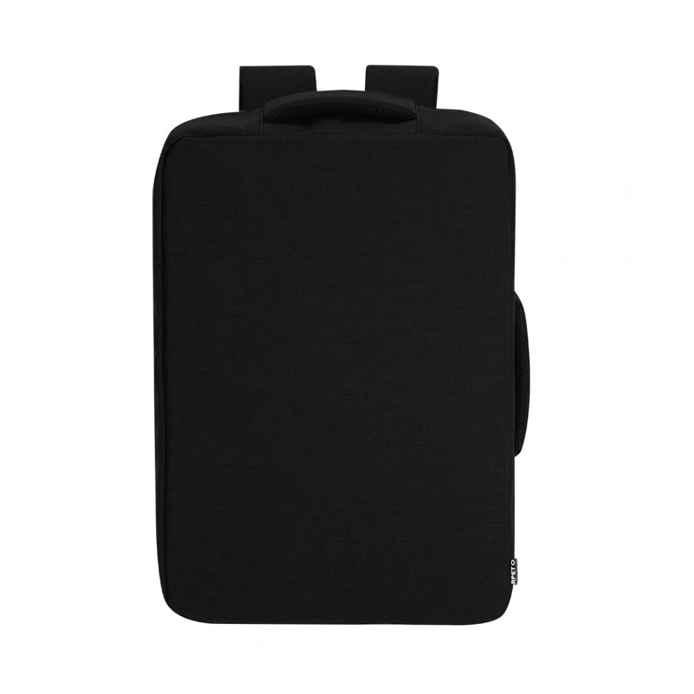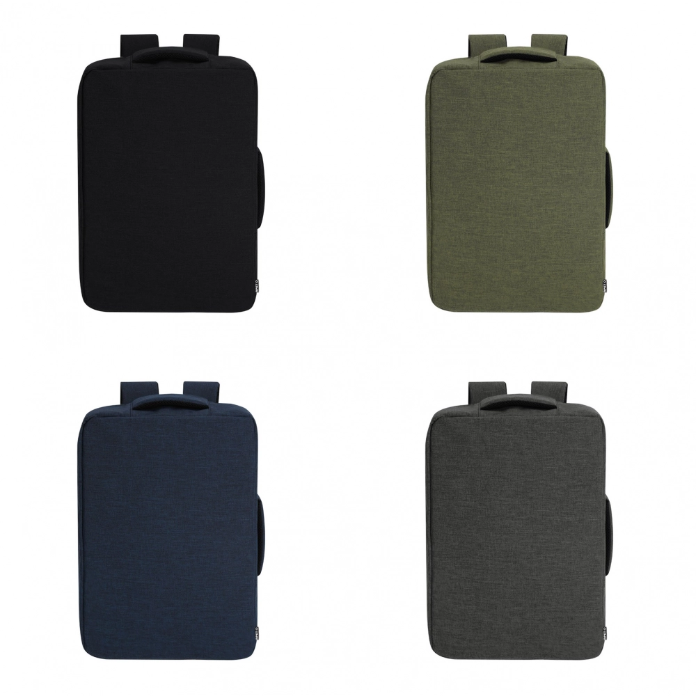 Document holder backpack made from durable RPET 300D. It features an urban design that incorporates a main pocket with a hidden zipper closure for added protection, with dual pullers. Includes a padded interior for laptops up to 15 inches, additional pockets inside for small items. Its shoulder straps and back are padded and adjustable for added comfort. Offers three transport modes: as a backpack, thanks to the padded shoulder straps; as a document holder, thanks to its carrying handle; and a strap for a trolley. The RPET material is made from recycled plastic, promoting the reuse of plastic waste and helping the planet's sustainability.