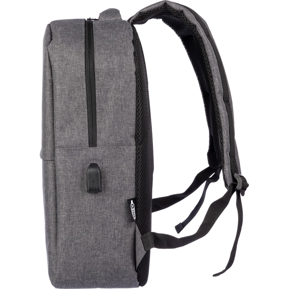 Laptop backpack 15", interior features a USB port and USB cable to charge devices, large zippered compartment on the topside, zippered front pocket, one compartment for 10" devices and one for 15" devices, adjustable shoulder handles, can be used to carry books, a laptop and small purchases or stationery, product made from RPET