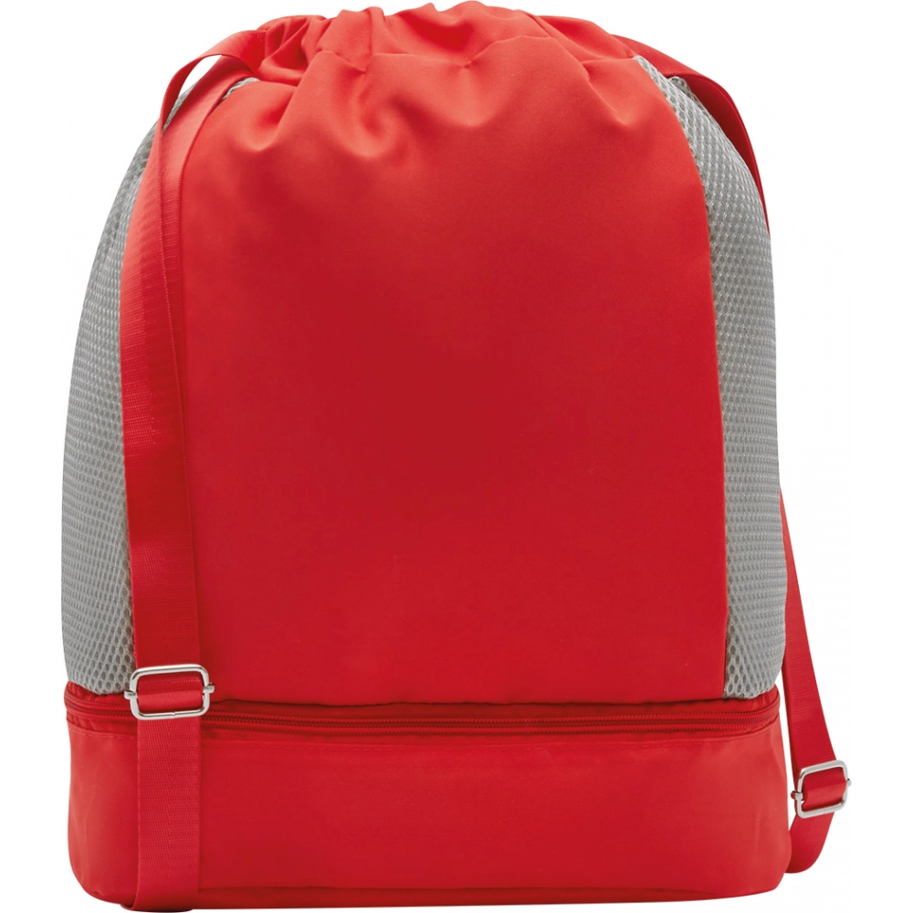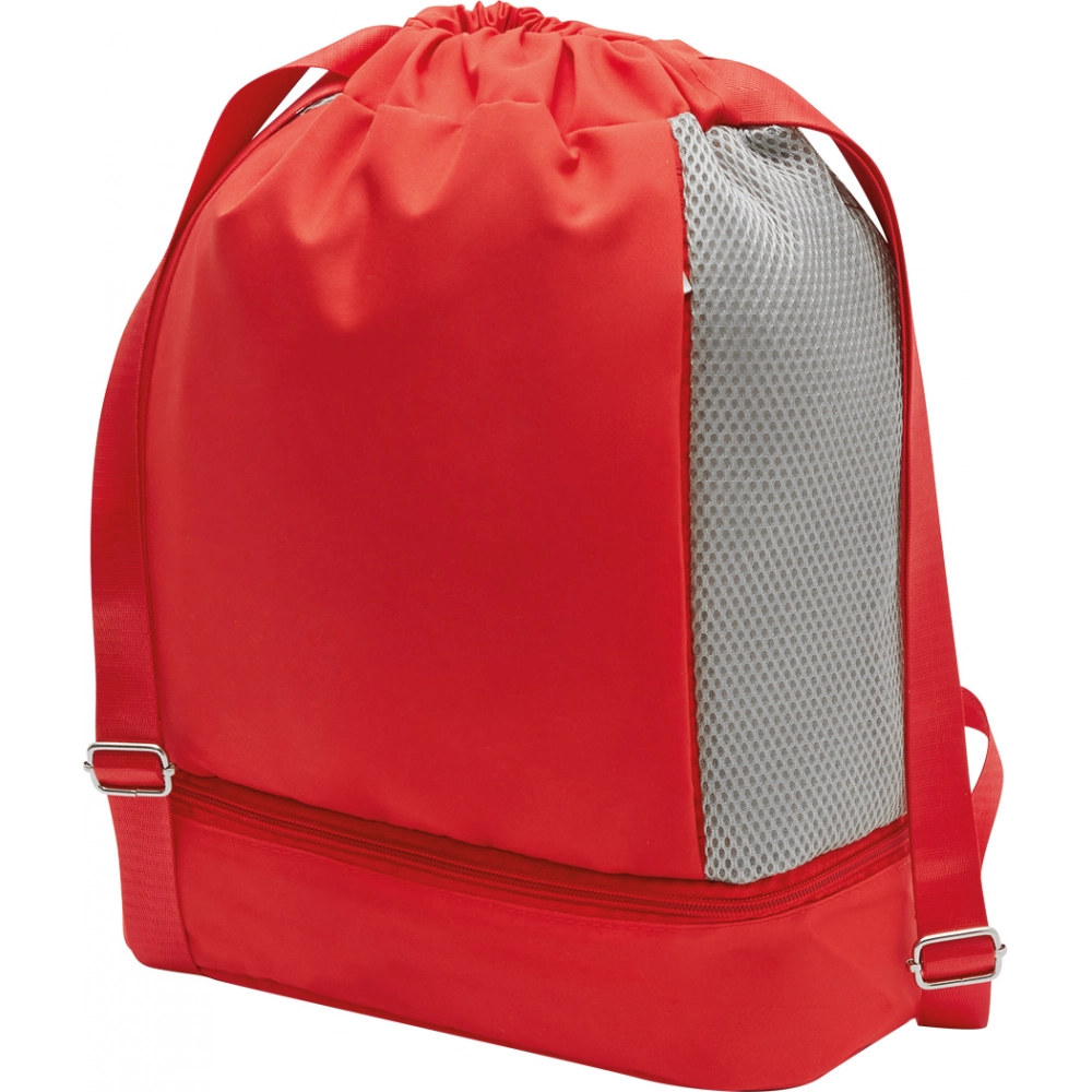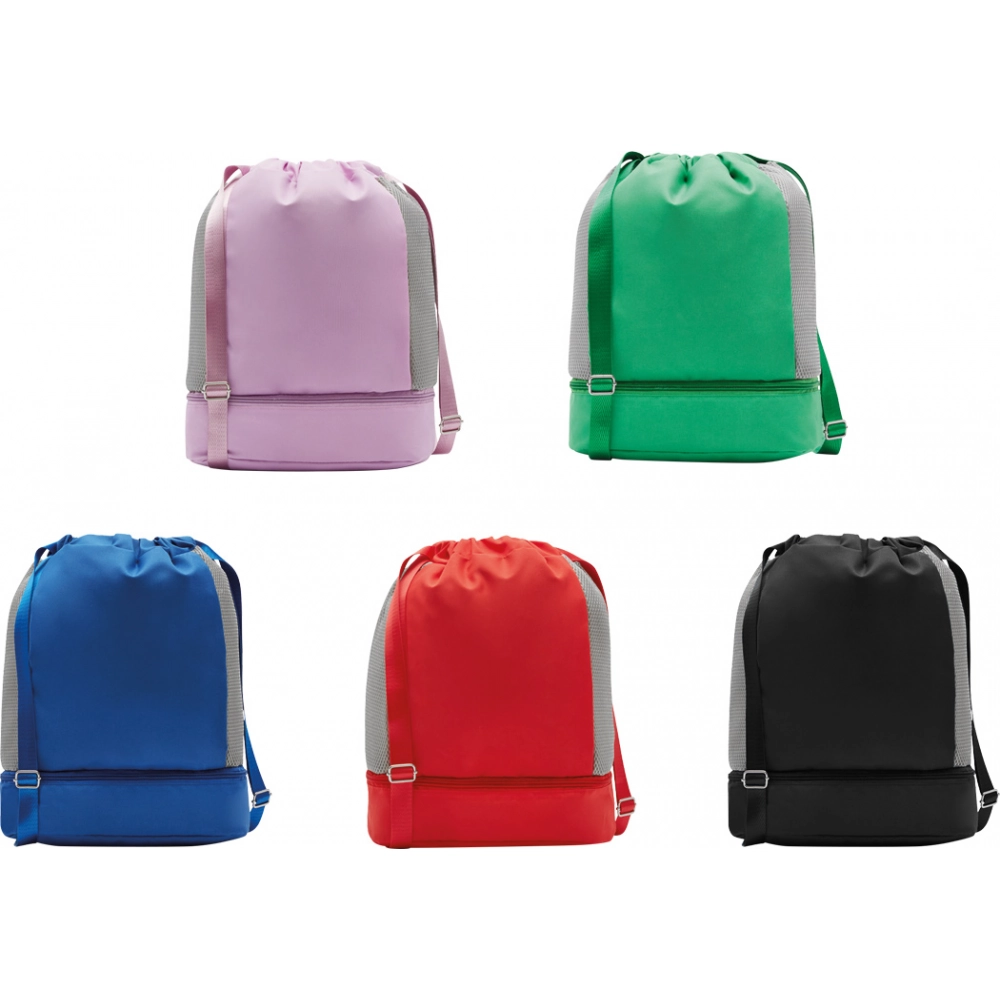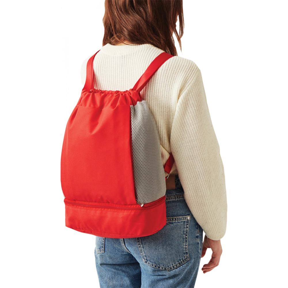 Backpack TRIP: with drawstring that serves as closure and shoulder straps (adjustable), 1 large zippered main compartment with 1 zippered inner pocket and 2 slip-in pockets, 2 zippered vertical front pockets, 1 zippered compartment at the bottom