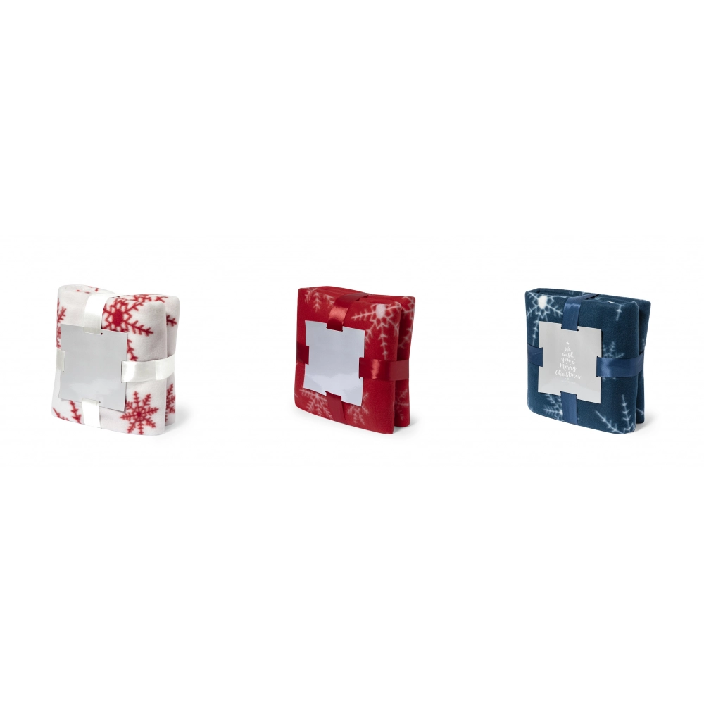Features 130x160cm blanket in an original red Christmas design with white motifs. In soft and warm polar fleece material of 200g/m2 with antipilling treatment. Presented with silver colored cardboard and matching color ribbon ribbon in soft polyester. Anti-Pilling