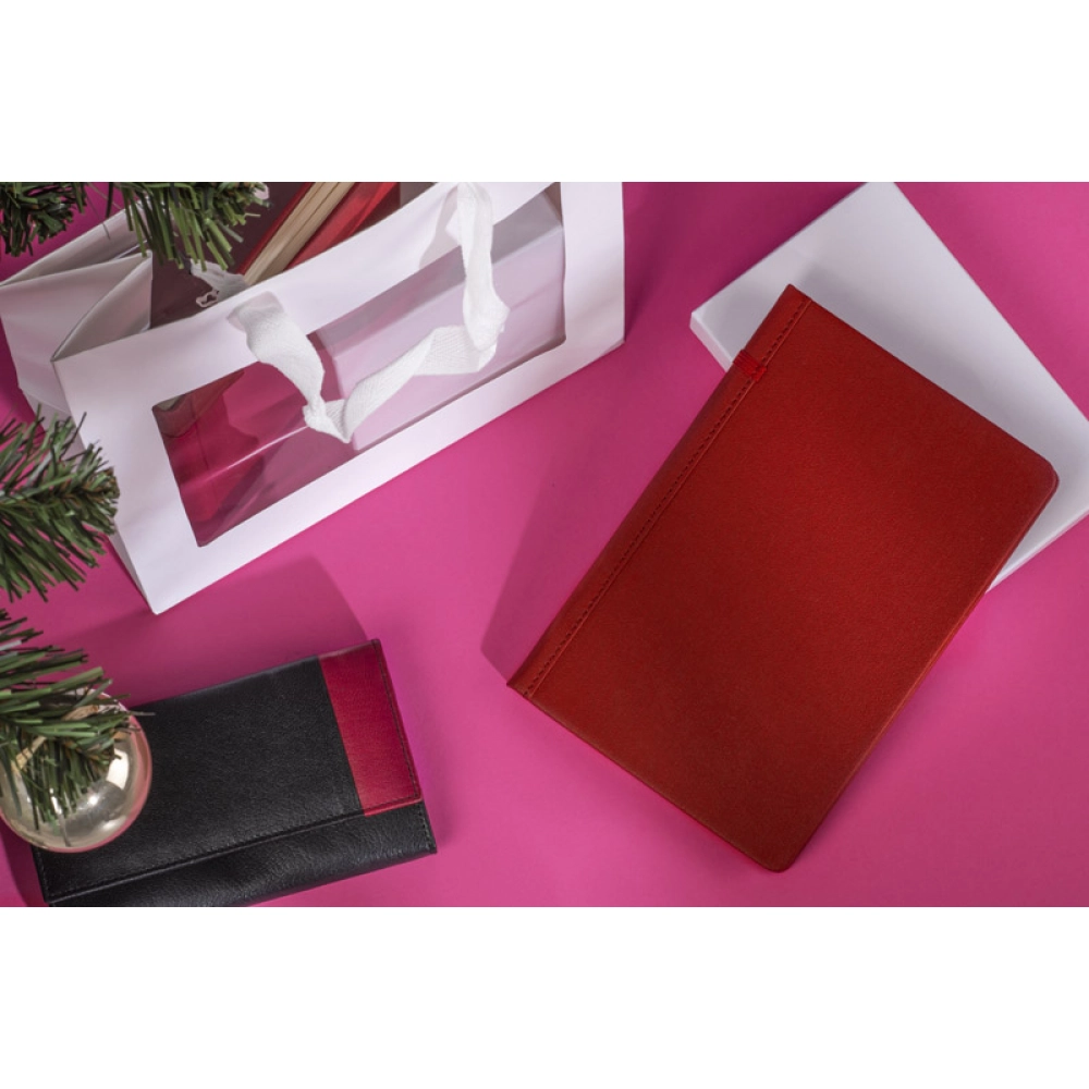 The HER gift set is an ideal proposition for women. It is aesthetic and tasteful. The set includes a wallet, notebook and a gift bag. The wallet is made of black genuine leather with a red insert, which makes the wallet look very interesting and extraordinary. It has an outer zipped pocket. Inside there are 5 tabs for credit cards, 5 pockets for documents and a zippered pocket. The notebook is made of eco-leather. It has a hard cover finished with a pleasant in touch texture. The whole set can be packed in the attached gift bag. It will beautifully display the gift packed in it. The bag is made of paper.