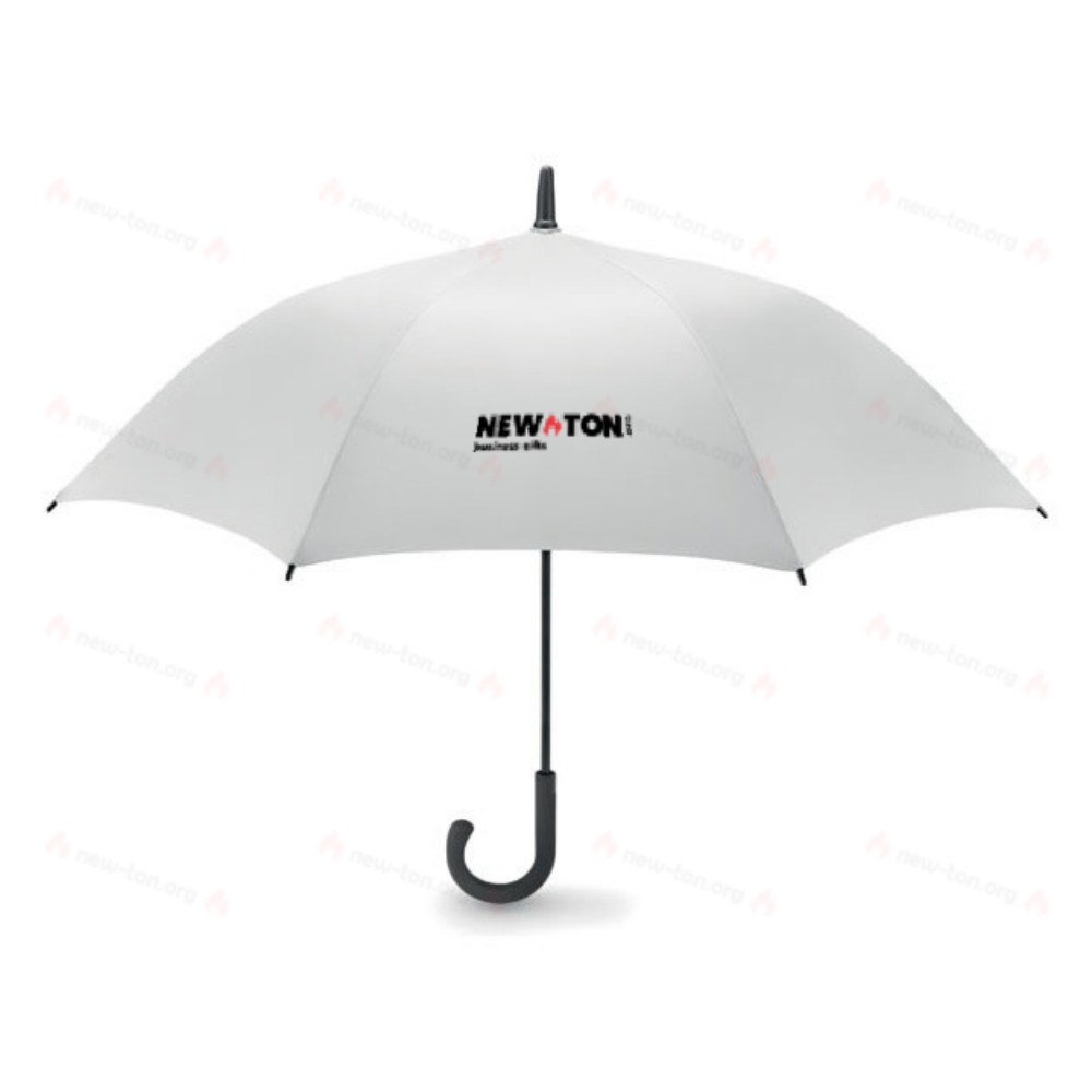 23 Inch auto open windproof umbrella in 190T pongee with black plated metal shaft. Black fiberglass ribs and black plastic tips. Curved black rubberised ABS handle with grey button. Manual closure.