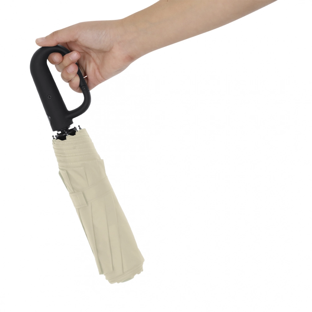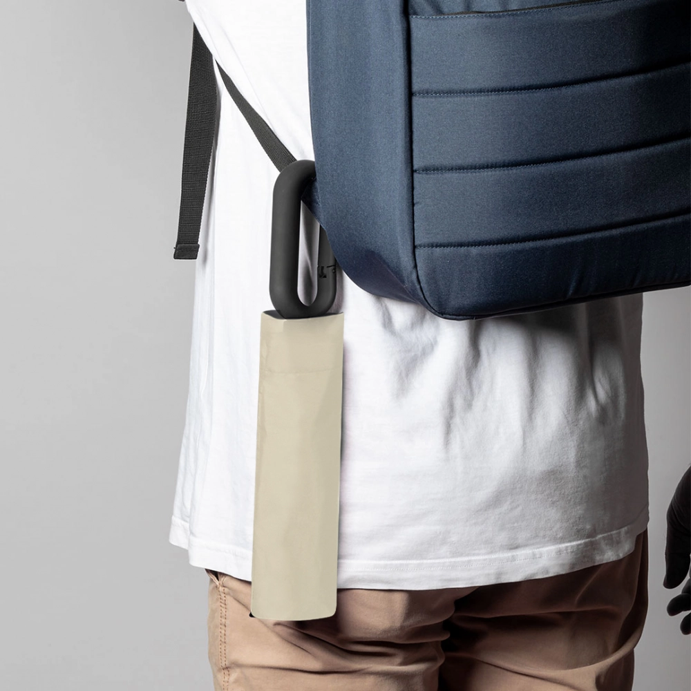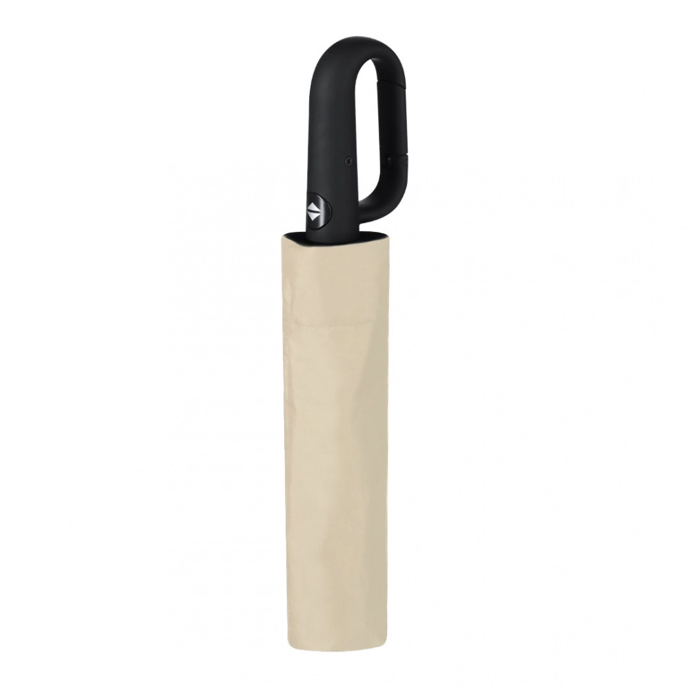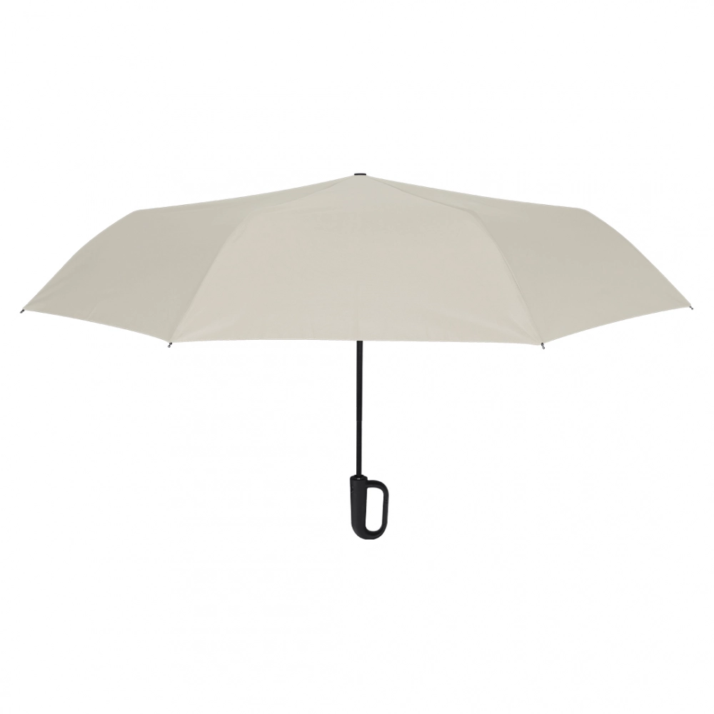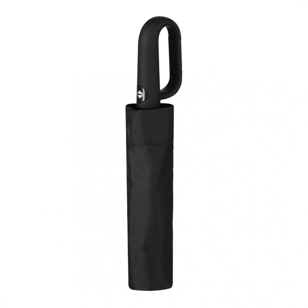8-panel folding umbrella in RPET. 100cm in diameter, automatic opening and closing, with windproof system and in resistant pongee material. With black fiberglass rods, velcro closure and ergonomic handle with integrated hooking carabiner. Presented in a matching individual case. Includes distinctive RPET logo. 21".