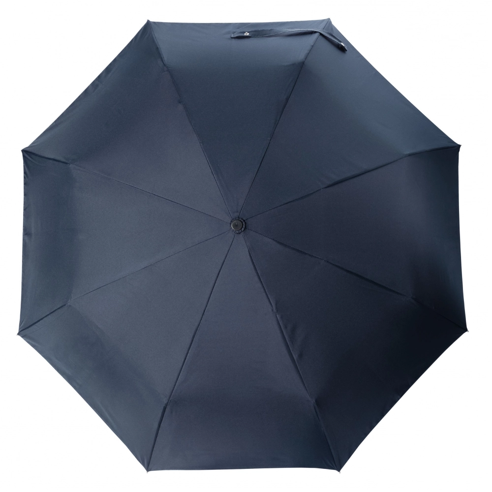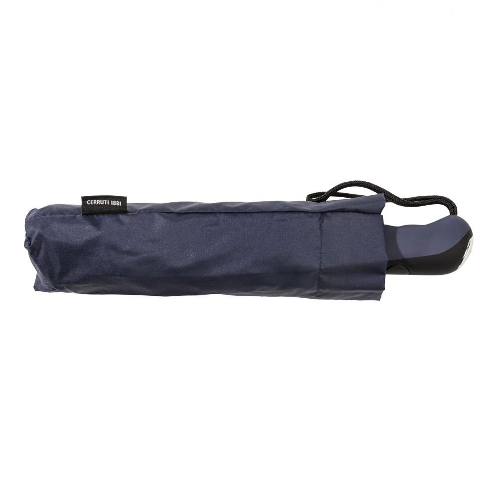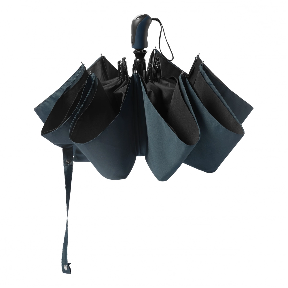 The "Irving" pocket umbrella is playing on the contrast between black and navy. Its double canopy is blue on the outside and black on the inside, and its ruberized finished handle is very comfortable in hand.