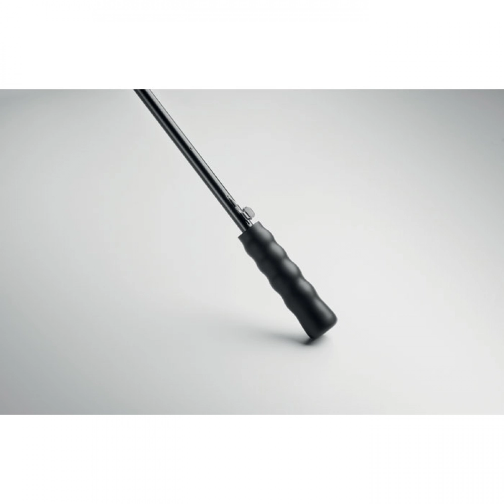 27 inch auto open wind-proof umbrella in 190T RPET pongee. Fibreglass shaft and ribs. Recycled Wheatstraw and ABS handle. Plastic tips and top.