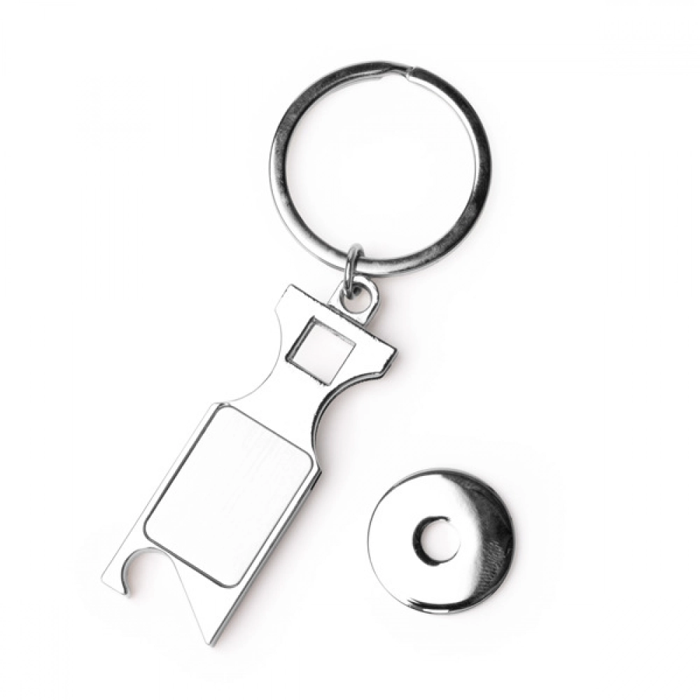 Металлический брелок с съемной монетой для тележки. Монету можно полностью извлечь и вставить в специально предназначенное для этого отверстие. Есть открывалка для бутылок на одном из концов.