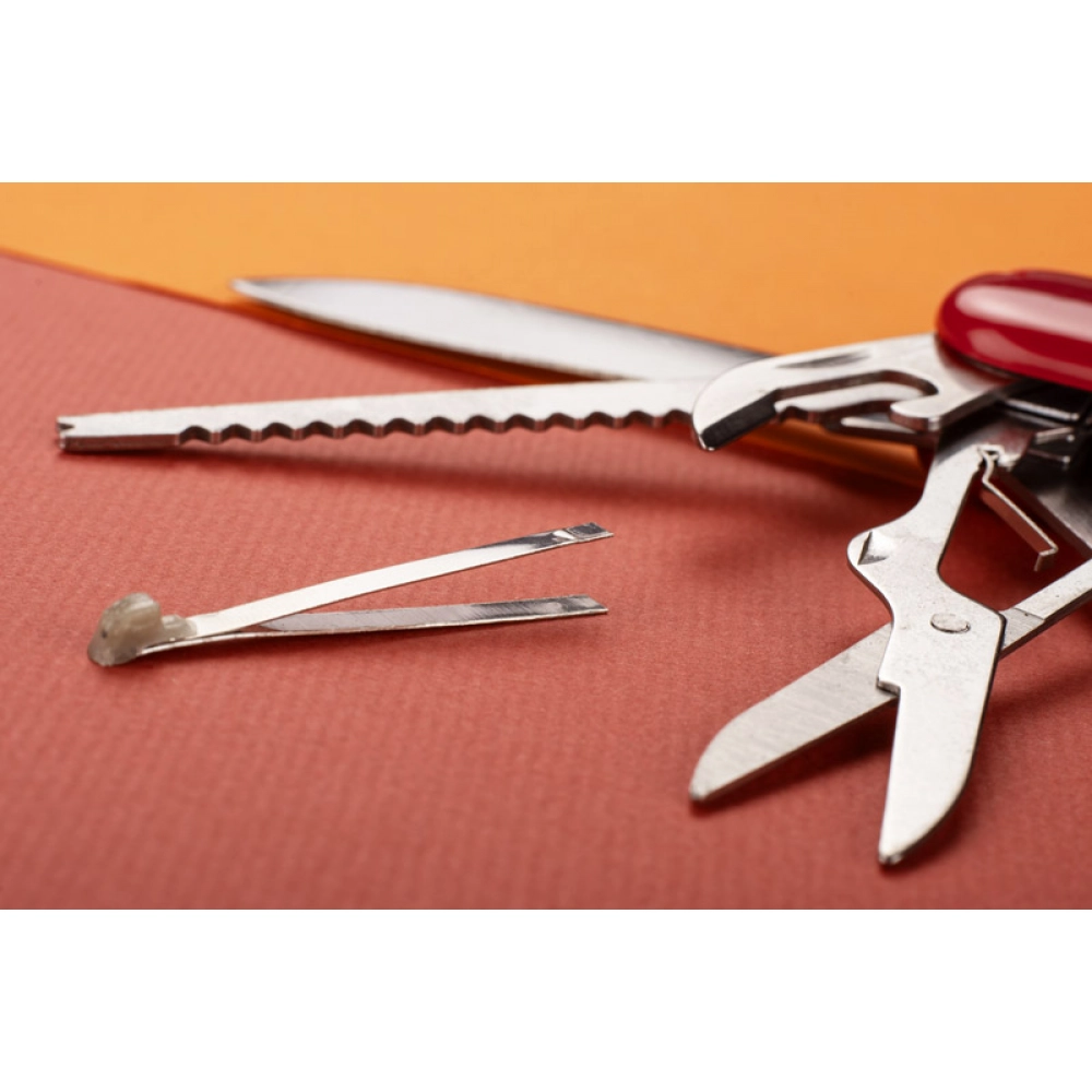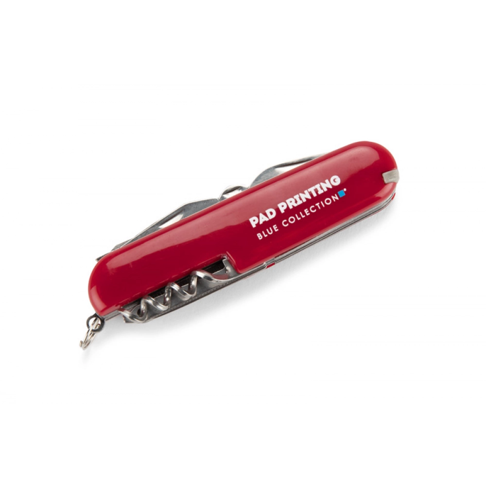 Карманный нож HIDI с красной пластиковой рукояткой. Этот инструмент оснащен всеми необходимыми функциями: нож, пила, скребок для рыбы, ножницы, открывалка для консервов, открывалка для бутылок, отвертка, штопор, шило и пробойник для кожи.