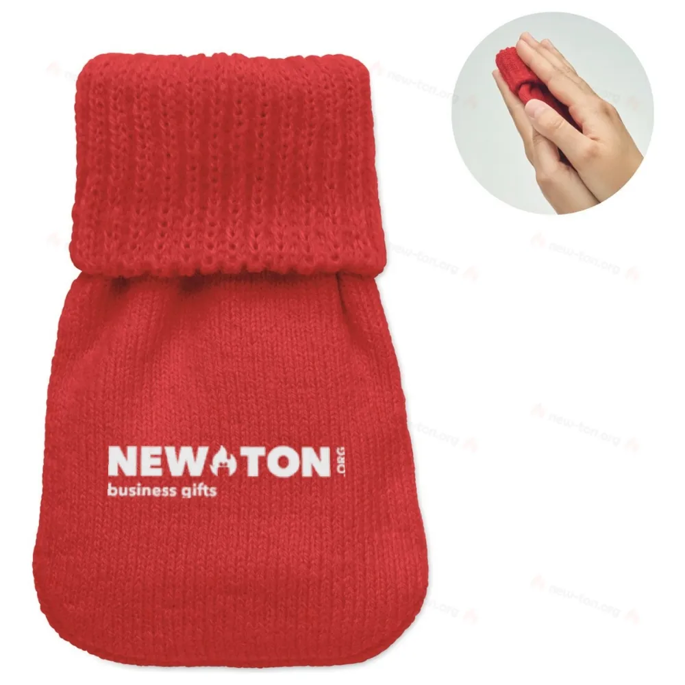 Грелка для рук с покрытием из вязаного полиэстера. Включает в себя грелку из ПВХ, которая активируется нажатием на металлическую пластину внутри. Можно использовать повторно, поместив грелку в горячую воду.