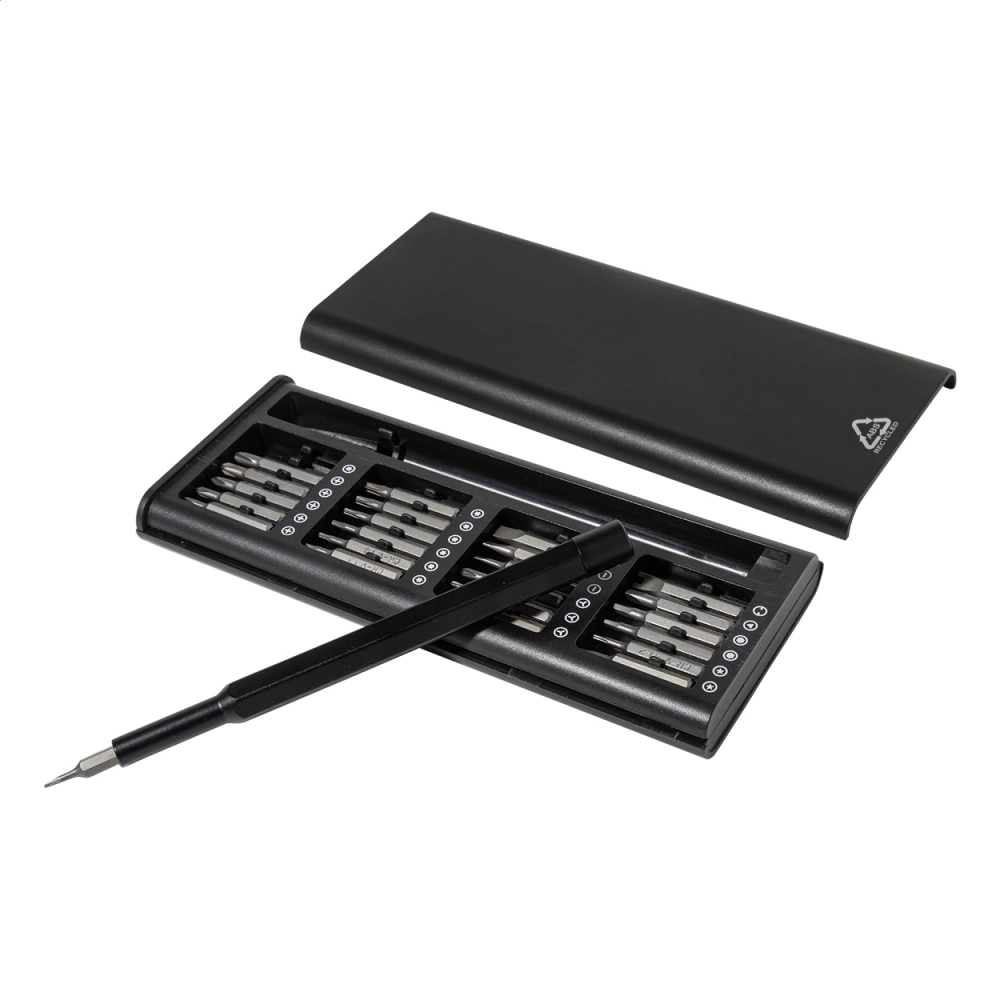 Набор прецизионных отверток с 24 насадками в корпусе из переработанного ABS-пластика. Рукоятка отвертки оснащена магнитным креплением насадок для быстрой и надежной их замены.