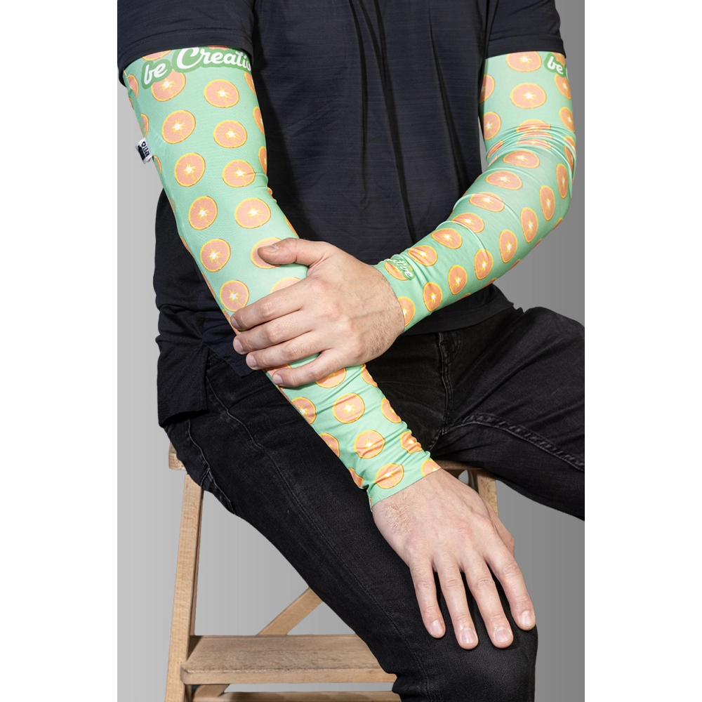 Одна пара эластичных рукавов из переработанного полиэтилентерефталата (RPET) с полноцветной сублимационной печатью. Состав: 92% переработанный полиэтилентерефталат и 8% эластан (185 г/м²), с характерным ярлыком RPET. Минимальный заказ: 50 шт. Размеры: M (8×12×48 см), L (9,5×13,5×52 см).