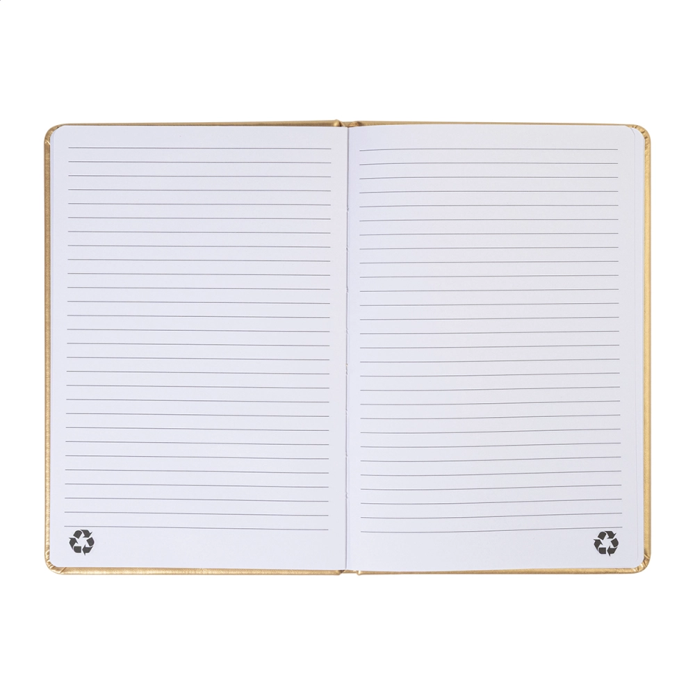 Блокнот с переплетом из переработанной кожи с металлическим оттенком, содержит 100 линованных листов из переработанной бумаги. В комплекте идет закладка и резинка в цвет блокнота. Размер A5.