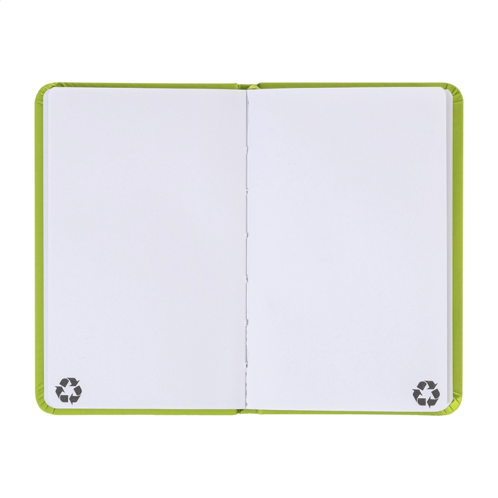Блокнот с обложкой из переработанной кожи PU с 100 пустыми листами из переработанной бумаги. С закладкой и резинкой в подходящем цвете. Размер A6.
