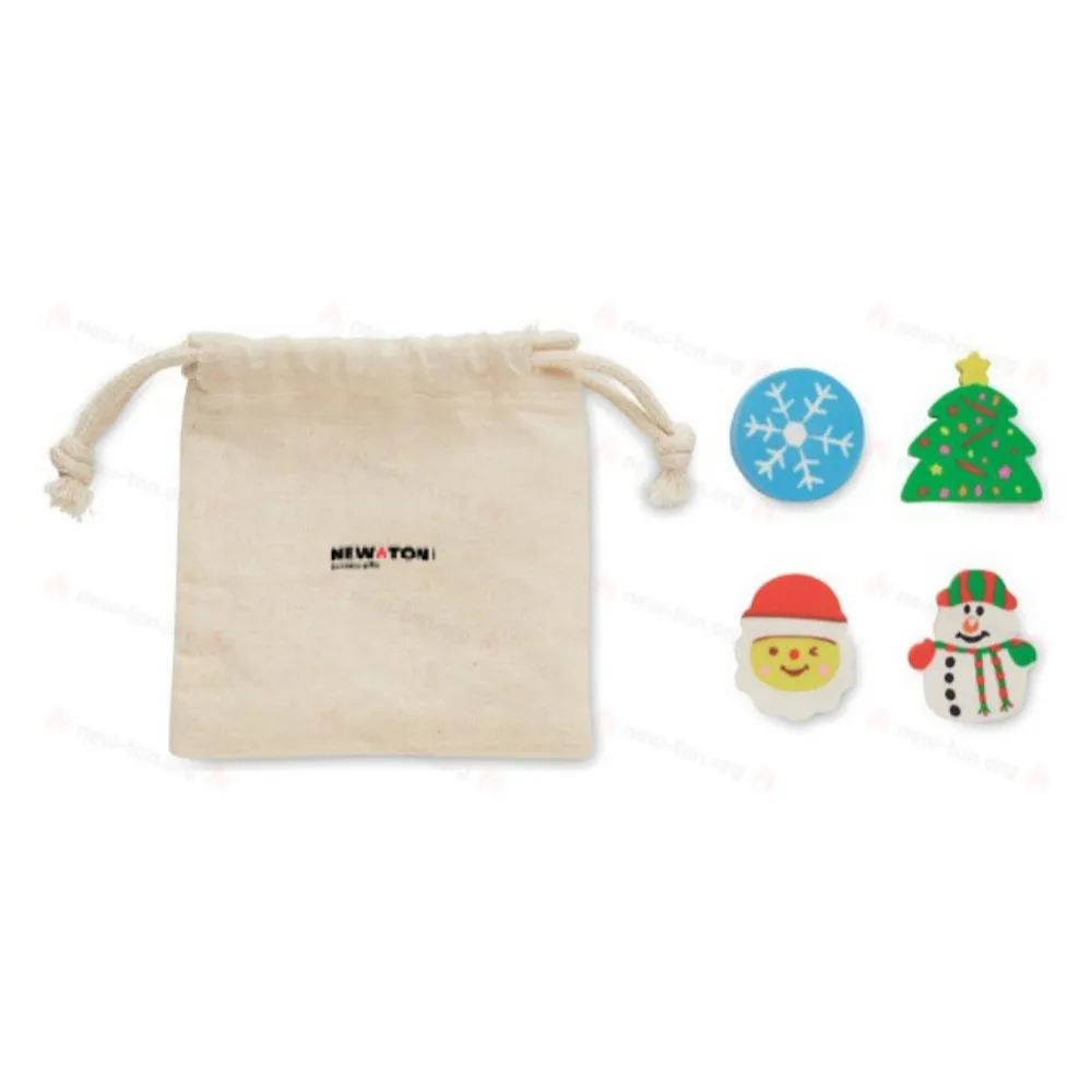 Набор из 4 различных рождественских ластиков: снежинка, Санта, елка и снеговик. Поставляются в хлопковом мешочке на шнурке.